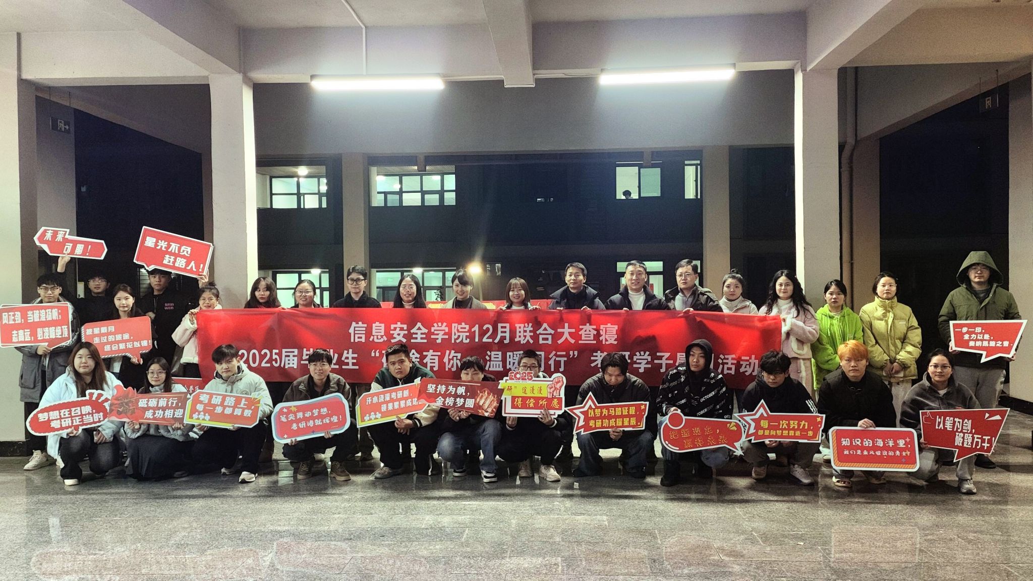 为提振学生考研斗志,增强考研信心,并进一步加强学生宿舍安全管理。2024年12月16日下午,信息安全学院院长王宁,学工副院长尹金维,教学副院长周小艳、学工办主任邹健、软件教研室主任王燚、就创办主任袁君以及团总支书记温朝一,带领全体2025届毕业班辅导员亲临考研学子的备考一线,向他们传递诚挚祝愿,为辛勤备考的学子们加油鼓劲。