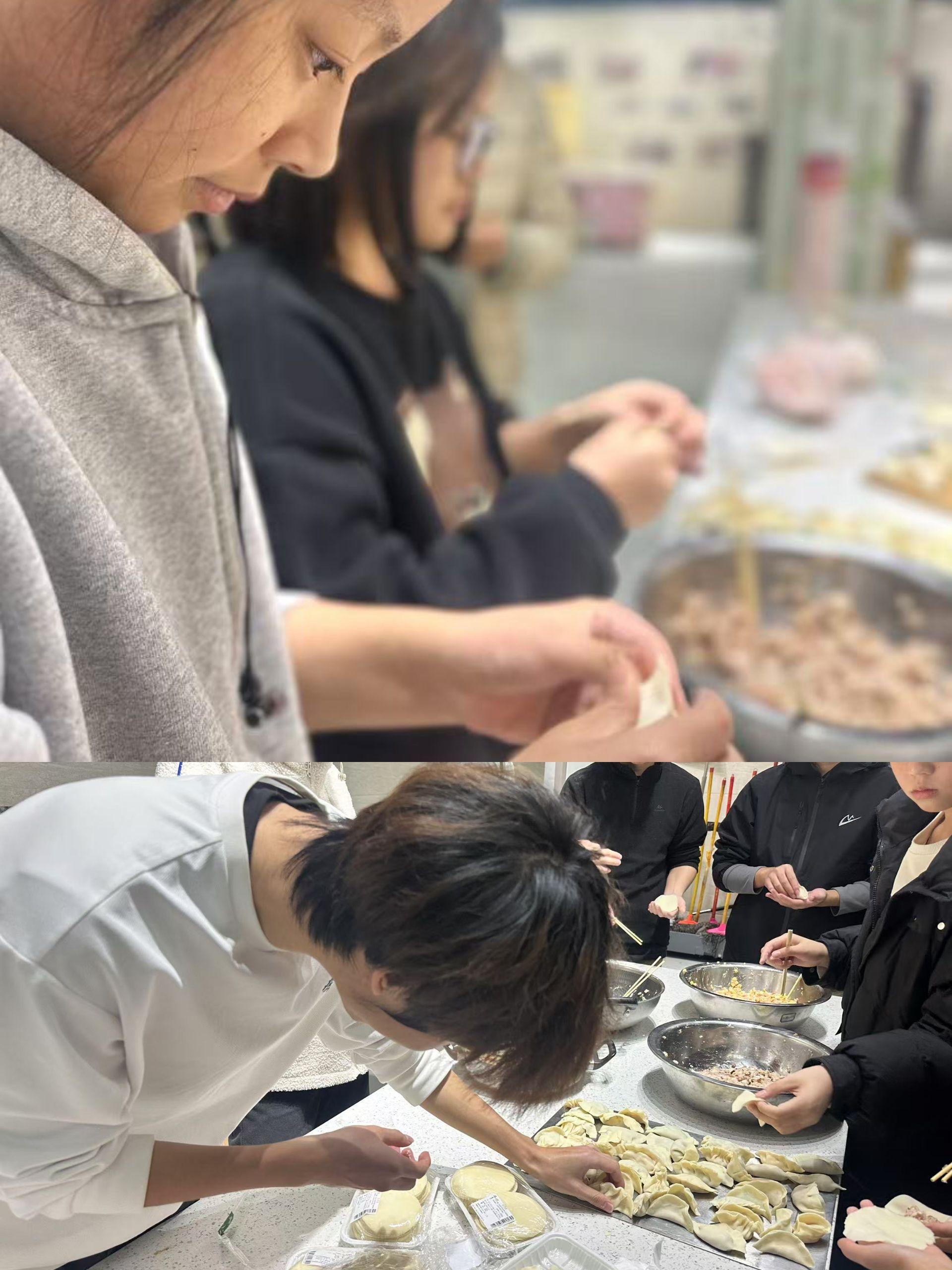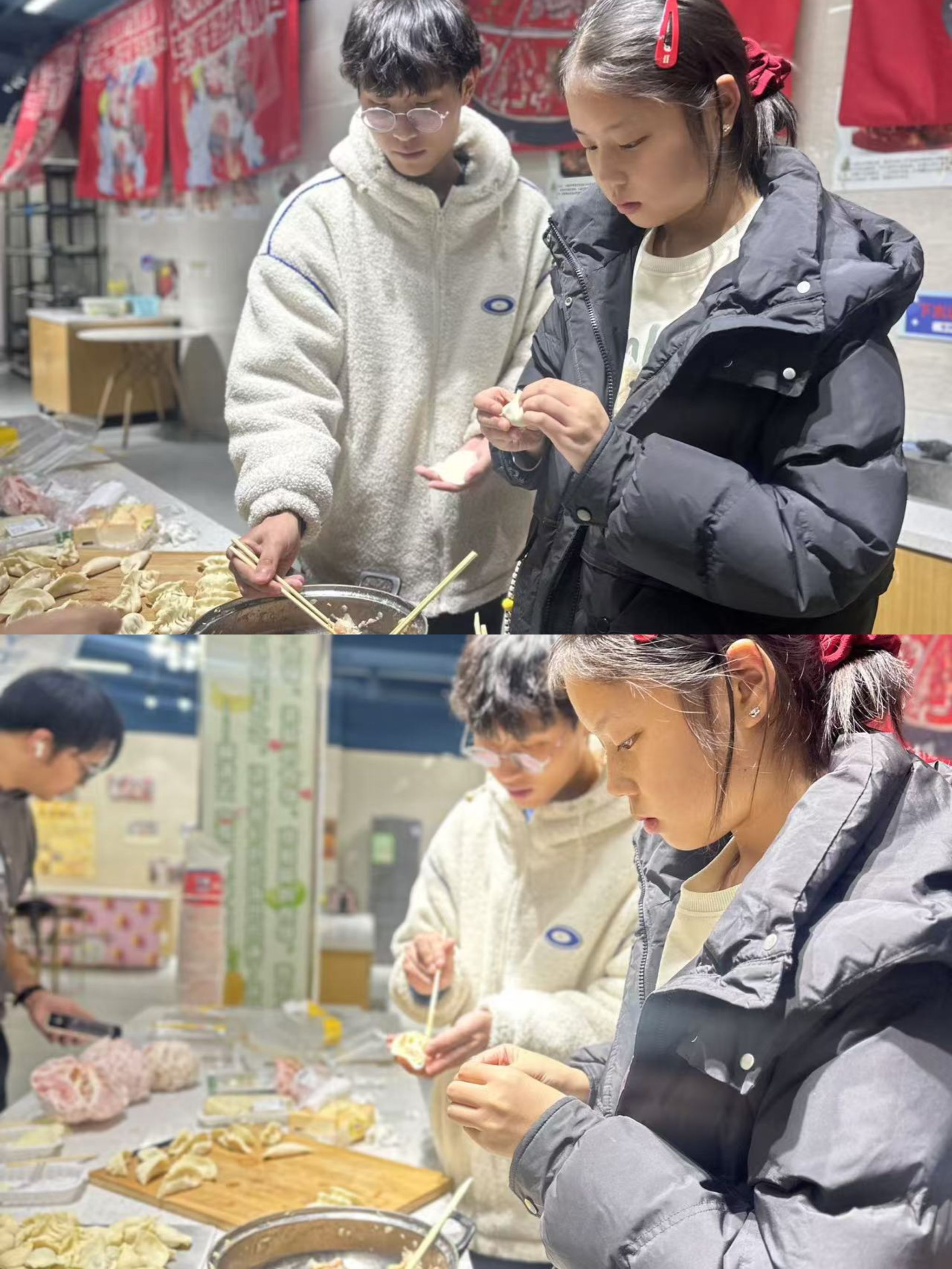 在宽敞明亮的厨房里,同学们围成几个小组,每张桌子上都摆满了包饺子的材料和工具。虽然外面寒风瑟瑟,但是大家脸上洋溢着兴奋和期待的笑容。