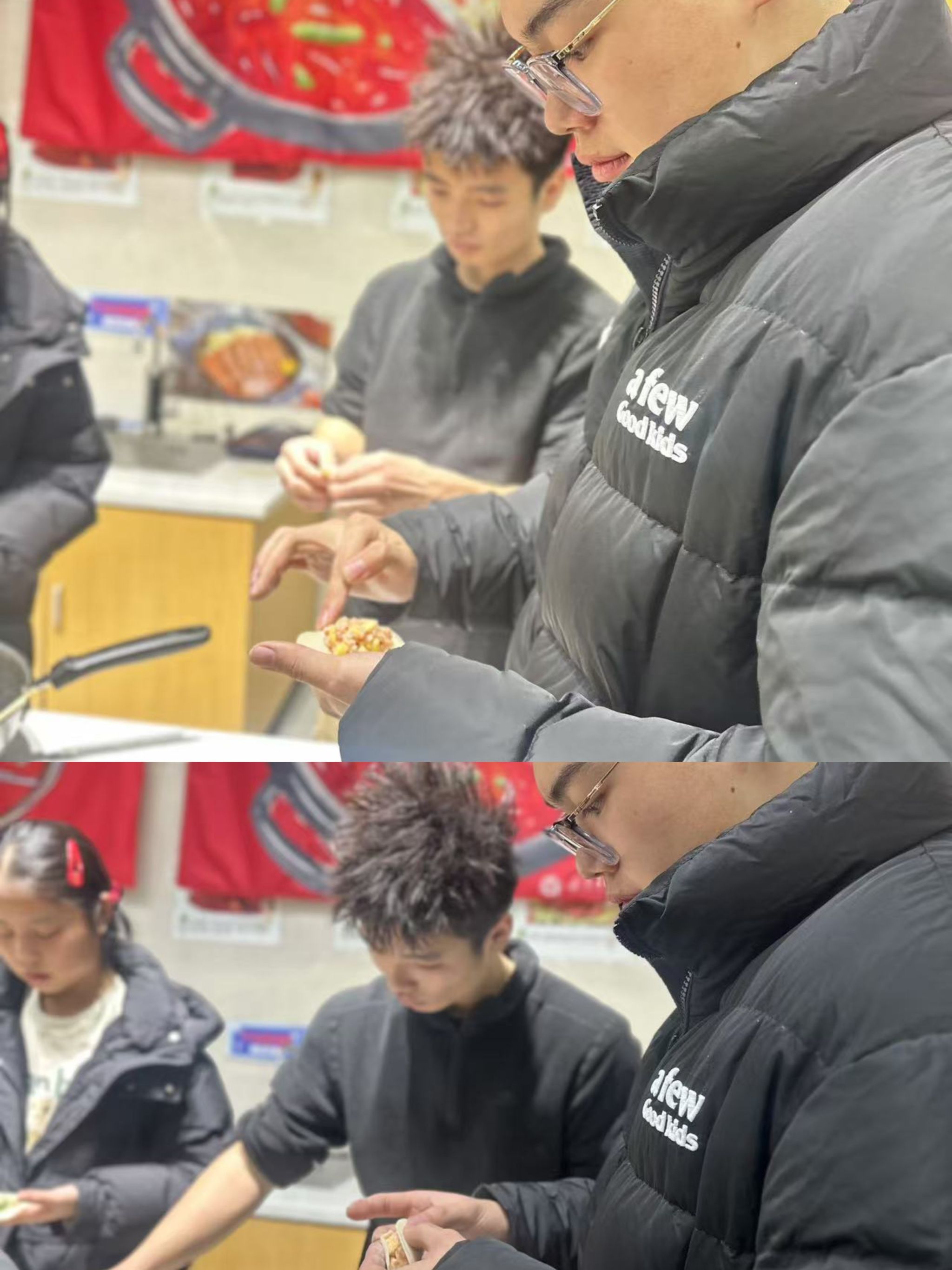 在包饺子过程中,同学们不仅学习了饺子的制作技巧,还了解了冬至的传统习俗和文化内涵。包饺子的环节最为热闹。同学们拿起饺子皮,放上适量的馅料,然后对折、捏紧,一个个形态各异的饺子就诞生了。有的同学包的饺子精致小巧,宛如艺术品;有的同学则追求速度,虽然形状略显粗糙,但那份参与的快乐却溢于言表。只见陈豪庭同学手拿饺子,细心的一点一点包好手中的饺子