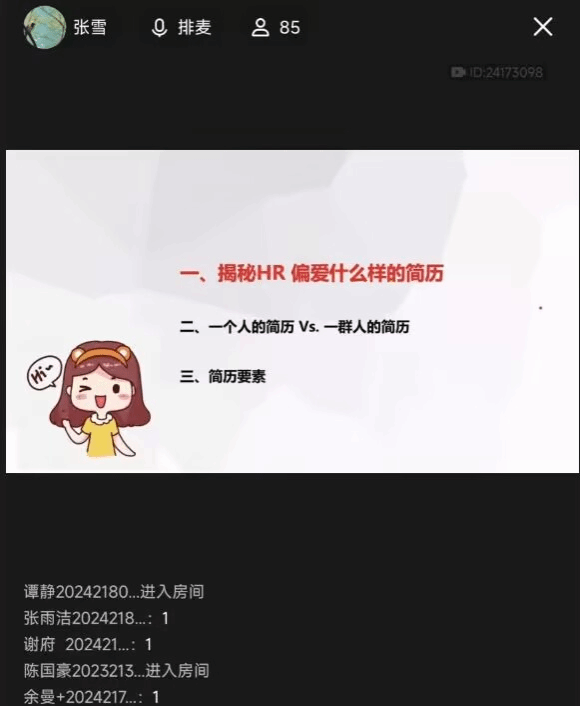 为帮助同学们加深对简历的了解,提升简历的制作能力,在未来就业创业中增加竞争力,信息安全学院团总支就业创业助理团举办的“精雕简历,巧琢前程”信息安全学院“信安创星营”系列活动之青云·茶话会就业沙龙第15期活动,于2025年1月15日14:00–15:30在线上会议开展。本次活动特邀张雪老师出席,吸引了100余人次学生热情参与。