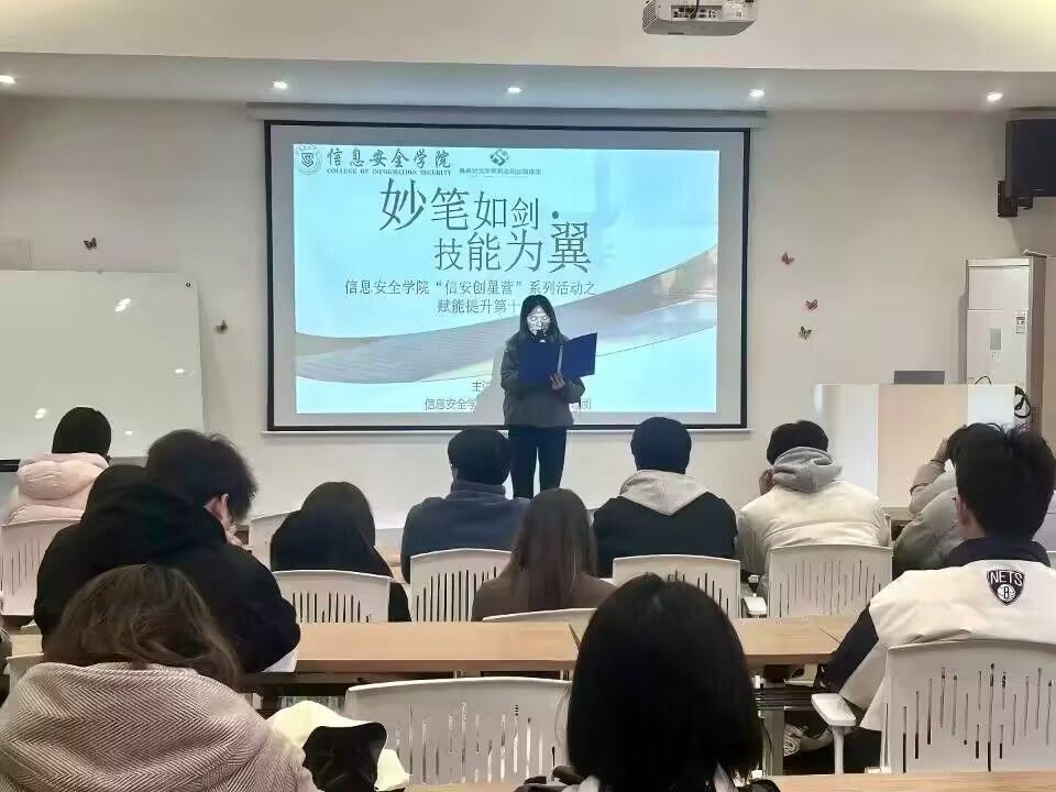 为提升学生新闻思维与素养,助力其在新媒体时代构建核心竞争力。信息安全学院团总支就业创业助理团于2025年3月05日14:00–16:00在南江书院庸言·研讨互鉴讲堂举办“妙笔如剑·技能为翼”信息安全学院“信安创星营”系列活动之赋能提升第十期活动。本次活动特邀资深媒体人郝树静老师担任主讲嘉宾,吸引了40余学生积极参与,活动由付丹丹同学主持。