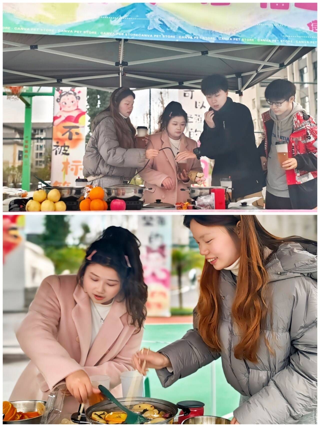 活动当天,行者楼前篮球场上人声鼎沸,热闹非凡,在工作人员精心布置的摊位前,聚集了众多对热饮制作充满好奇与兴趣的师生。摊位上整齐摆放着各式各样的热饮制作材料,包括新鲜的水果、醇香的茶叶、甘甜的红糖等,让紧盯着的师生们目不暇接。”
