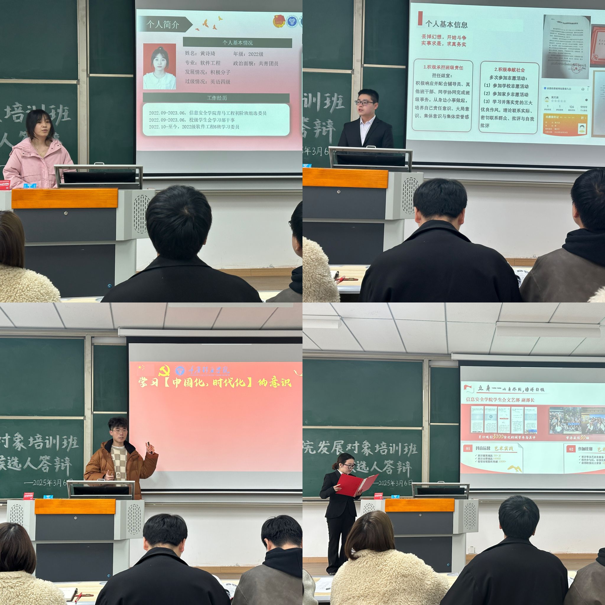 为全面考察积极分子的综合素质,为党组织吸纳优秀人才,扎实做好党员发展工作,加强党员队伍建设,2025年3月6日,信息安全学院学生党支部在贤者楼313教室开展了2025年春季发展对象答辩推选会。信息安全学院学生党支部22名教师党员参加本次会议,14名积极分子参加本次答辩。