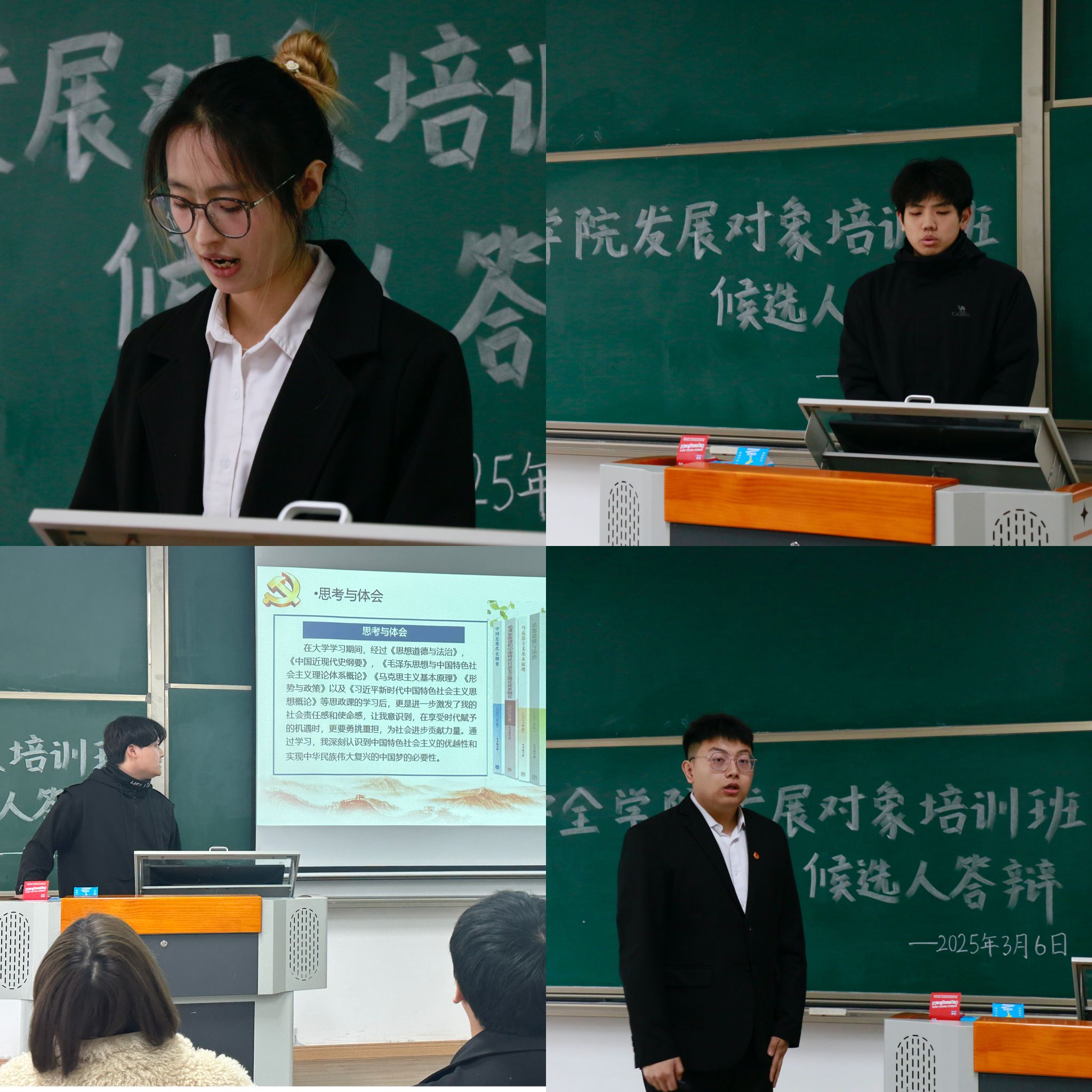 随后,积极分子依次上台进行阐述。在对党的认识方面,他们结合自身学习与感悟,深刻表达对党的性质、宗旨、指导思想的理解,表明自己加入中国共产党的坚定决心和为党的事业不懈奋斗的信念。谈及学习,同学们分享各自的学习方法与成果,展现出勤奋刻苦、积极进取的学习态度,不少同学在专业课程中取得优异成绩,还积极参与各类学术竞赛和科研项目。在社会实践板块,大家踊跃讲述参与志愿服务、实习实践、社团活动的经历,体现出高度的社会责任感和较强的实践能力,在服务他人、奉献社会中不断提升自我。老师们依据同学们的综合素质、答辩表现及对党的认识程度进行评分。