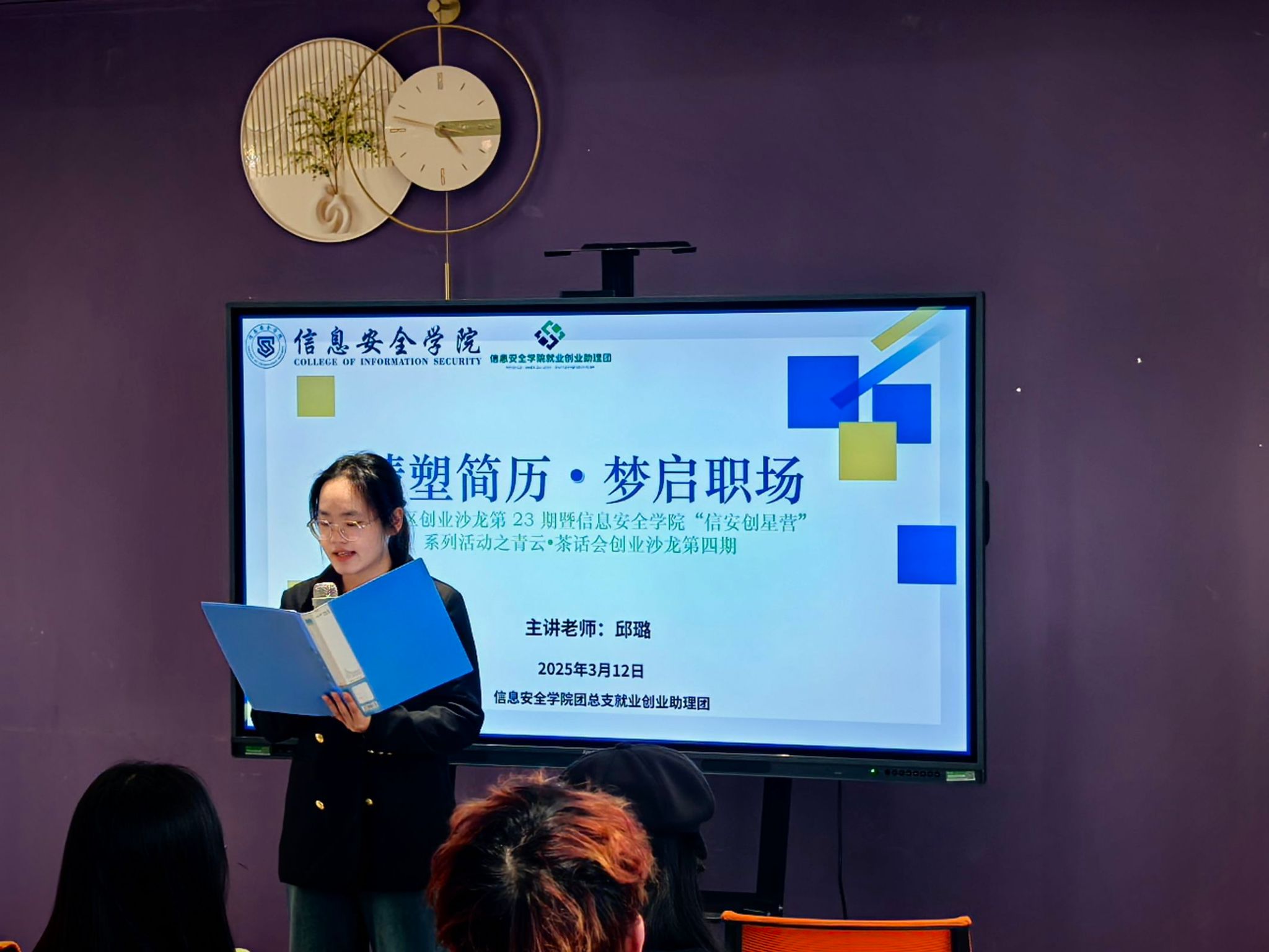 为助力同学们深入了解简历知识,提升简历制作能力,增强未来就业创业的竞争力。信息安全学院团总支就业创业助理团于2025年3月12日14:00-16:00在观云书院芒种·华文书吧顺利开展“精塑简历·梦启职场”信息安全学院“信安创星营”系列活动之青云·茶话会就业沙龙第16期。本次活动特邀邱璐老师出席,共计50余名学生参与,由潘玉兰同学主持。