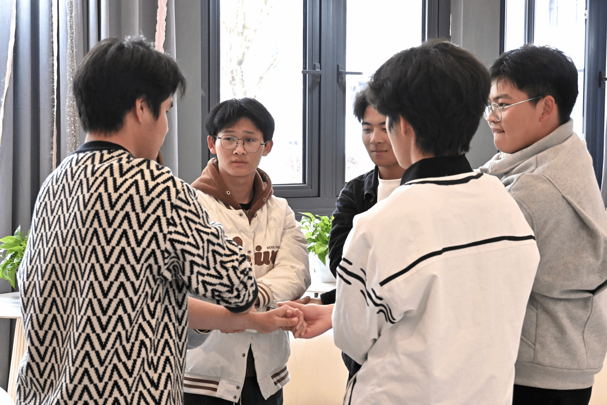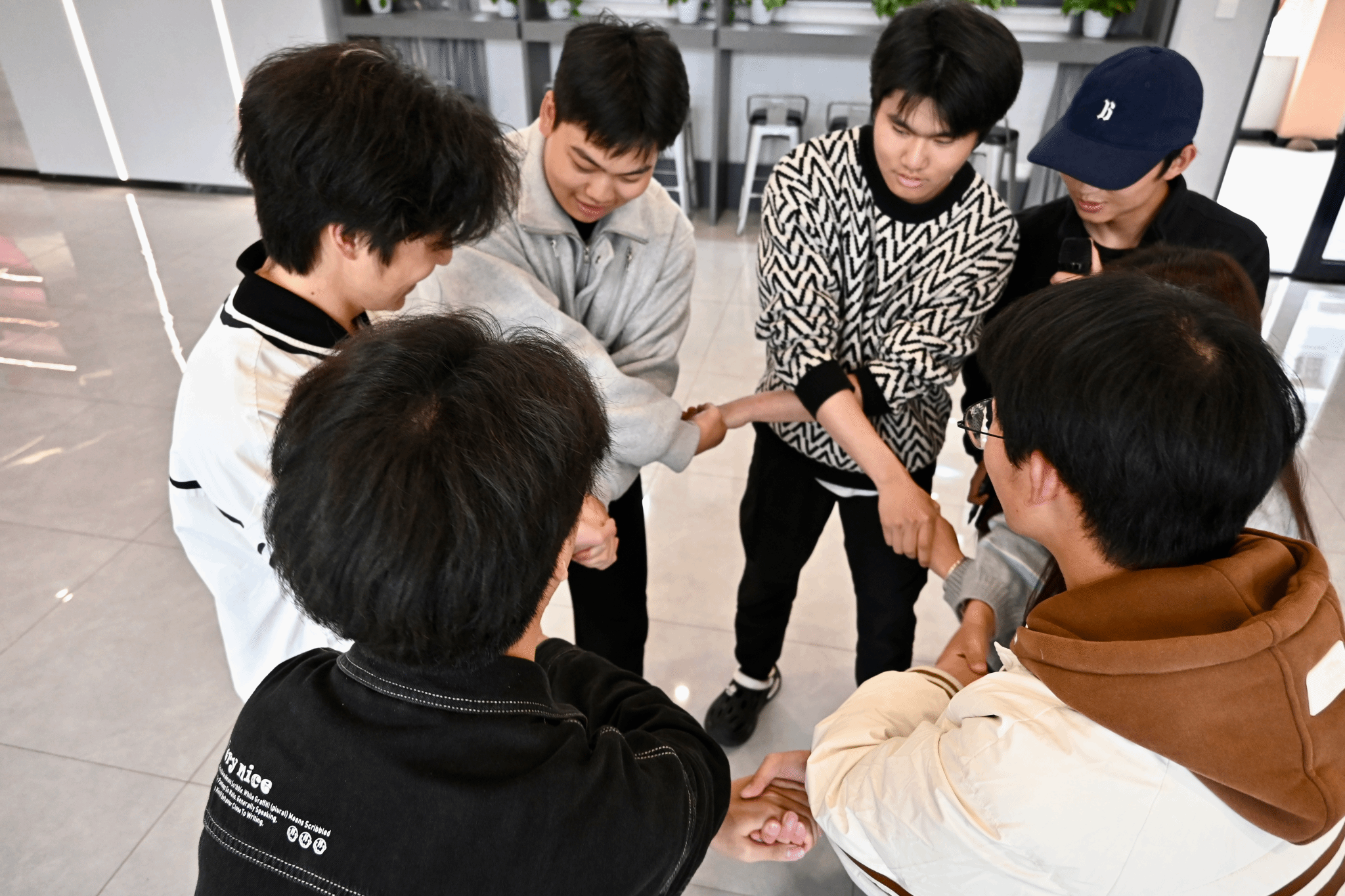 紧接着的是解手链游戏,它将团队协作推向了高潮。所有队员围成一个圈,双手交叉握住身边同学的手,在不松开双手的情况下解开复杂的“手链”,这需要极高的团队默契和智慧。游戏中,同学们互相配合,积极沟通,展现了出色的团队协作能力。有的小队通过巧妙的转身和调整迅速解开了“手链”,而有的小队经过多次尝试后找到突破口,最后解开了“手链”。最终“墨梅凌霜队”以1.97秒的超快速度解开了“手链”赢得了本环节的胜利。