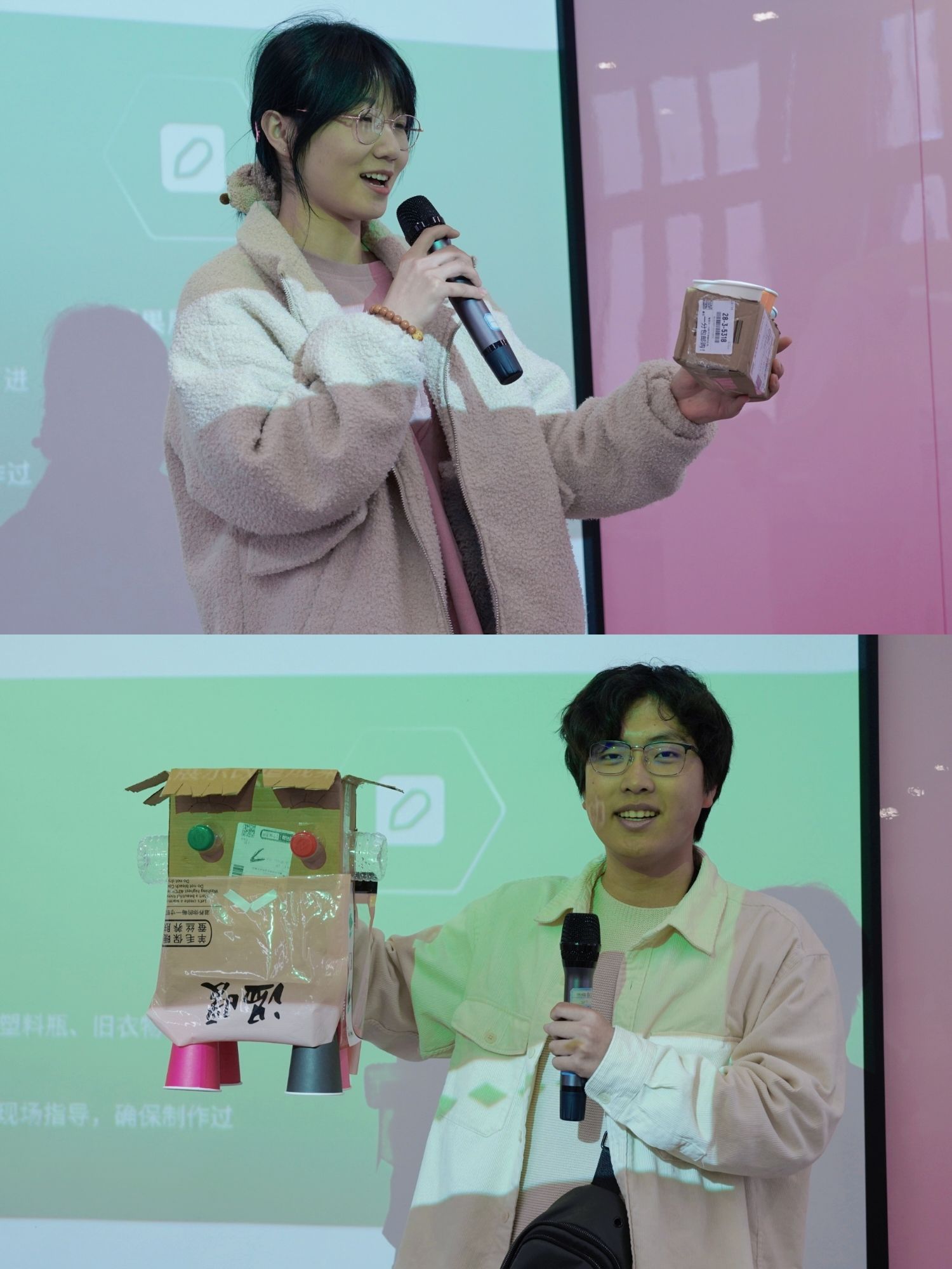 经过两小时的巧思与实践,一件件作品惊艳亮相。同学们充分发挥想象力和创造力,让废旧物品焕发新生,制作出一个个独具匠心的作品。在展示环节中,各组代表不仅详细讲解设计理念与功能,更分享了团队协作中的趣事与感悟。有同学感慨:“原本堆在角落的纸箱,经过改造竟成了实用艺术品,环保真的可以如此有趣!”