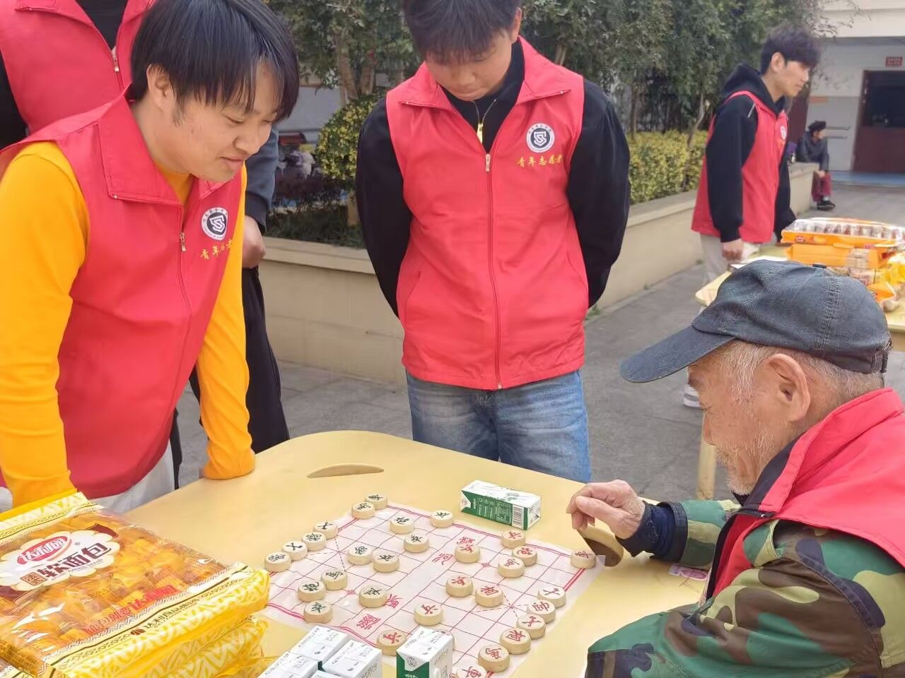 随后,活动进入分组游戏阶段。下象棋、五子棋等游戏精彩纷呈,志愿者们与老人一一组队,携手参与游戏,共同分享喜悦。志愿者黄文旭同学在与老人博弈的过程中,互相交流,探讨下棋的每一步与奥妙,大家也都观棋不语,认真欣赏这次棋盘的交锋。在互动过程中,每一位志愿者细微的举动都传递着浓浓的关爱,老人们与志愿者们相互交流,欢声笑语回荡在整个养老服务中心。游戏结束后,志愿者们围坐在老人身旁,亲切地陪他们聊天、唠家常,耐心倾听老人们讲述过去的故事,给予他们情感上的陪伴与支持。