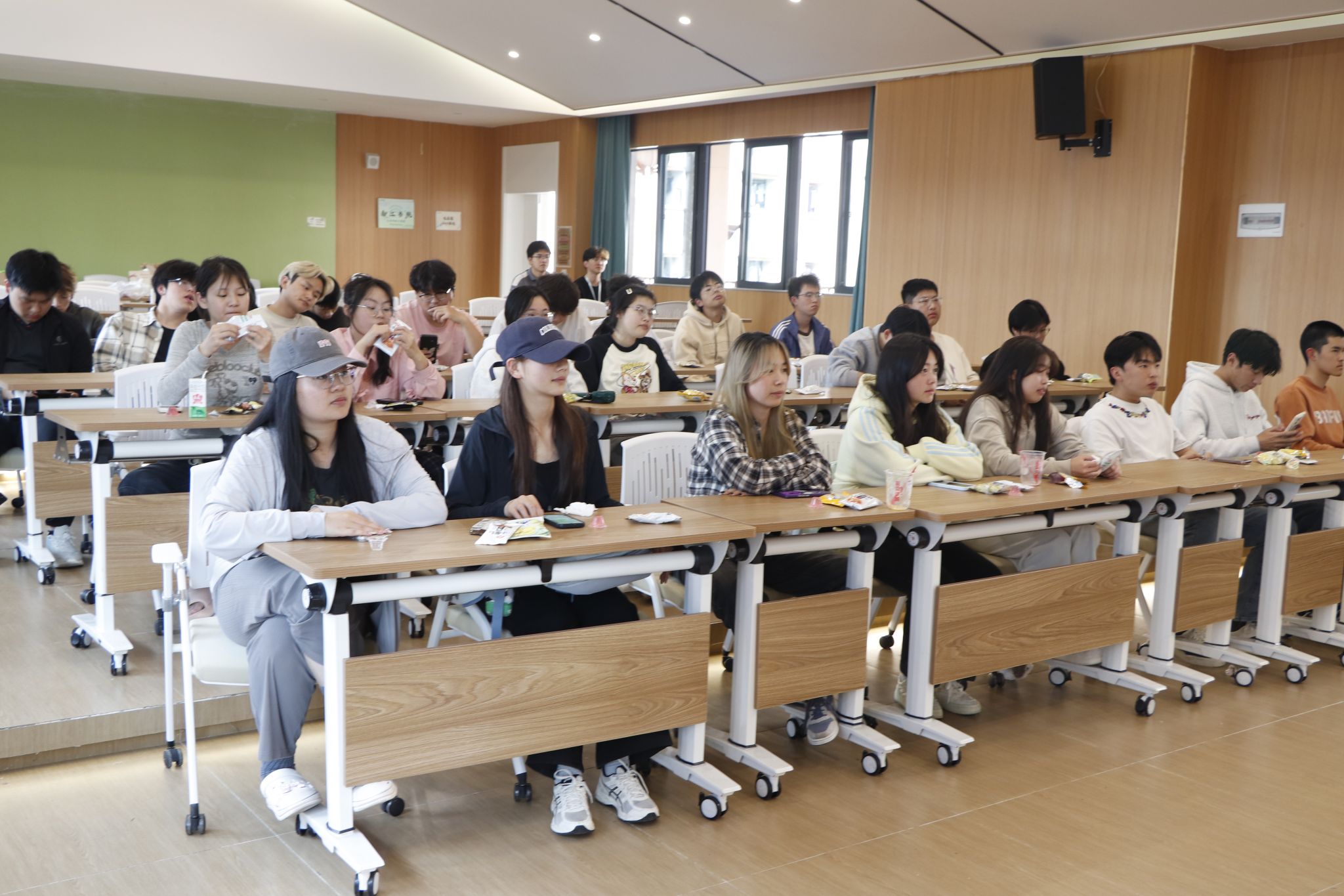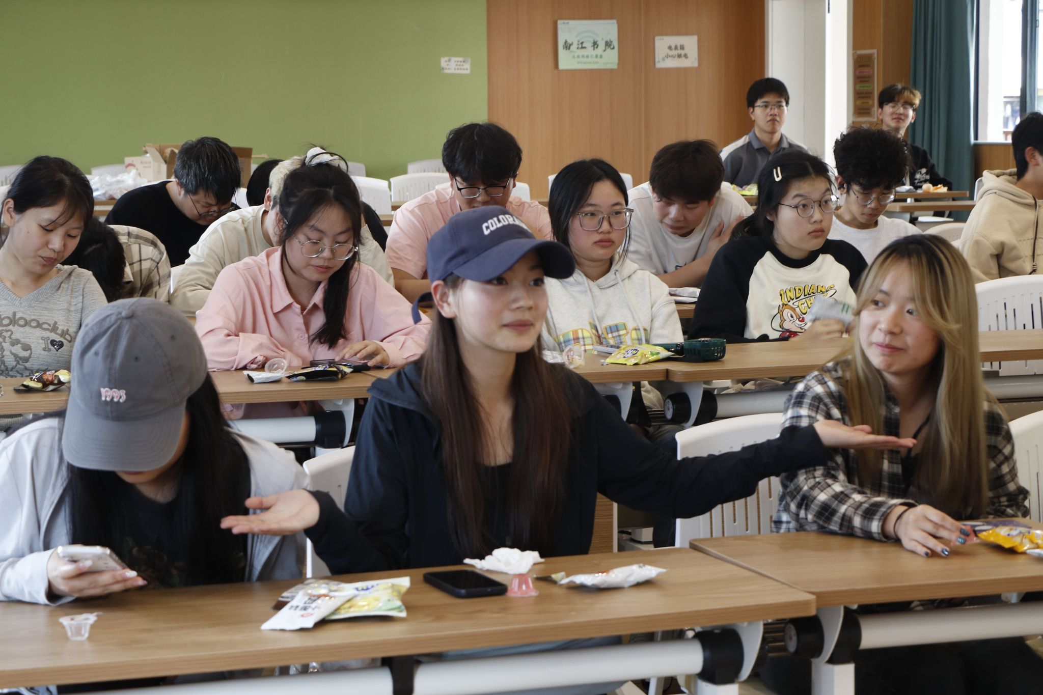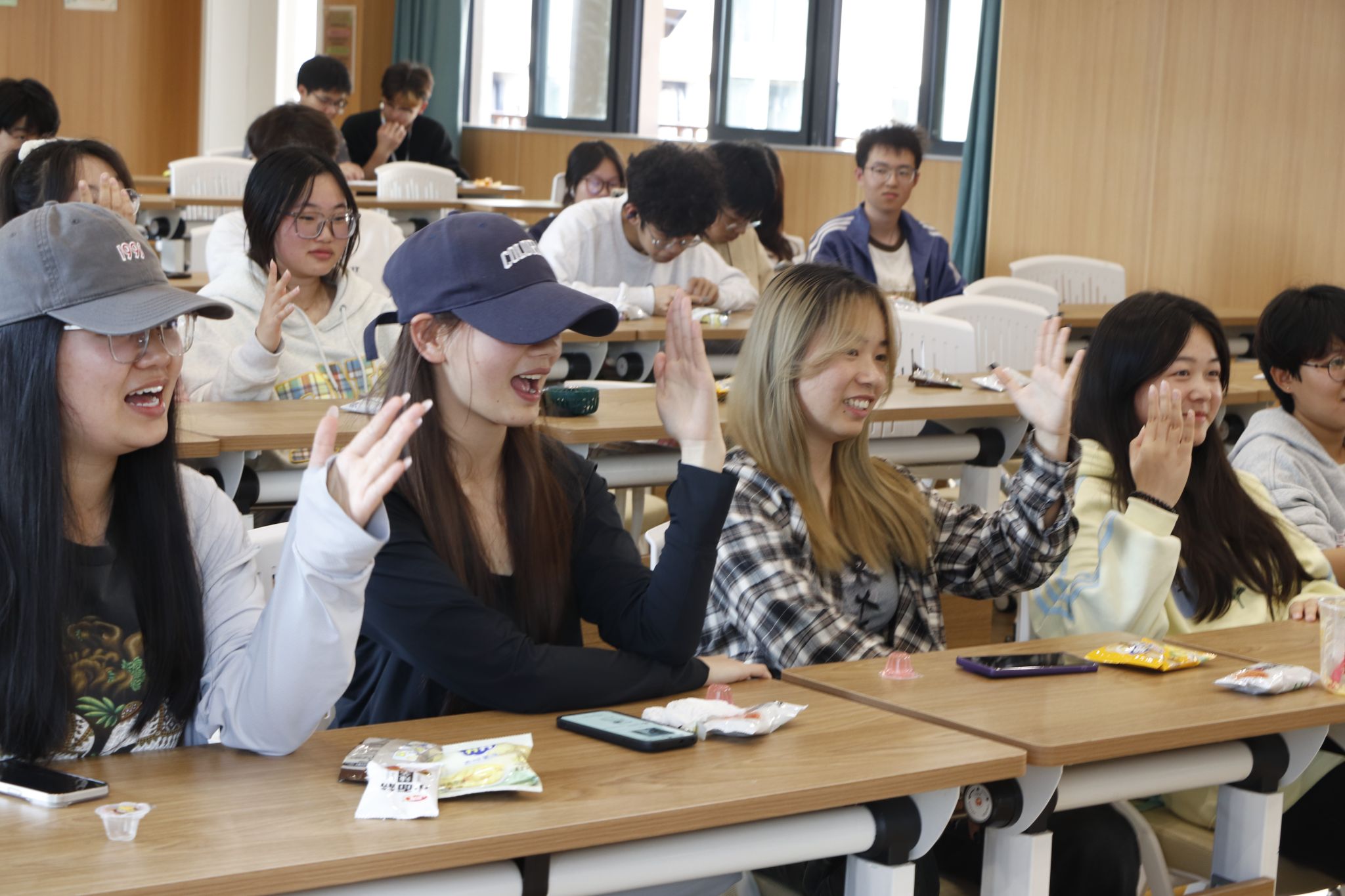 随后的创意游戏环节推向活动高潮。“胡辣汤”中,同学们激积参加,主持邀请观众说出人数,由从前到后依次顺序一起下蹲,接着依次从前到后轮着所说人数下蹲,蹲错蹲慢则挑战失败,看着选手们一个接一个的下台,你胜我败的决心由最后二人开展。“胡辣汤”活动锻炼了同学们的反应能力和策略思维,该充满新奇与挑战的趣味游戏带动了积极向上的班级文化。