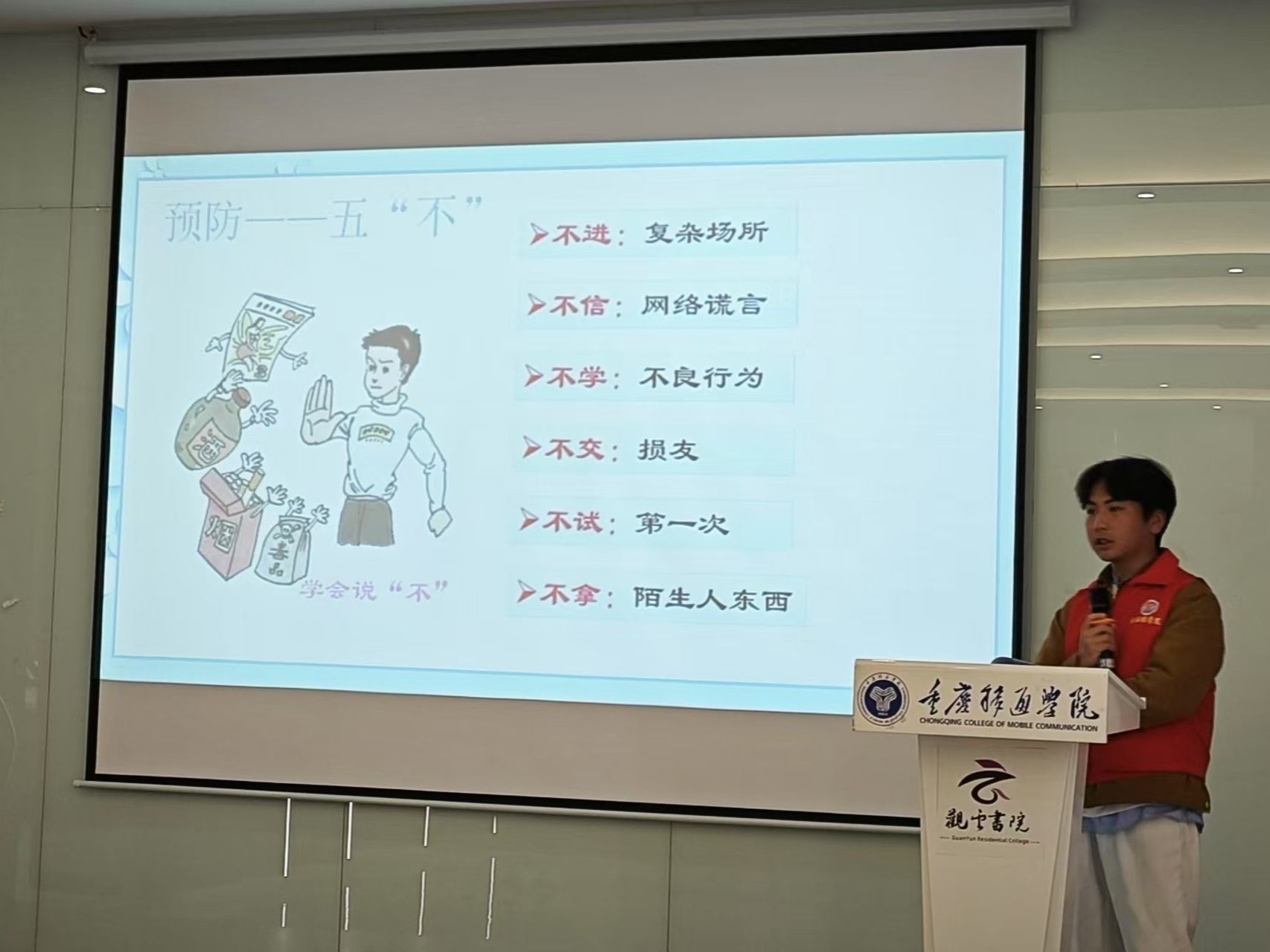 最引人关注的是“如何防范毒品的危害”,宣讲人员向我们传授了防范毒品的“四不原则”,分别是不轻信陌生人、不进入高危场所、不接受不明物品、不盲目追求刺激,并演示拒绝毒品的语言技巧,如“我过敏,不能碰”“谢谢你,我不需要”。还有在喧闹场所要看管好自身的物品,以防他人做手脚,如在KTV或酒吧,离开自己视野的饮料坚决不能再喝,可以再换一杯,谨防饮品变毒品。同学们认真听取,表示会以行动来践行禁毒教育。