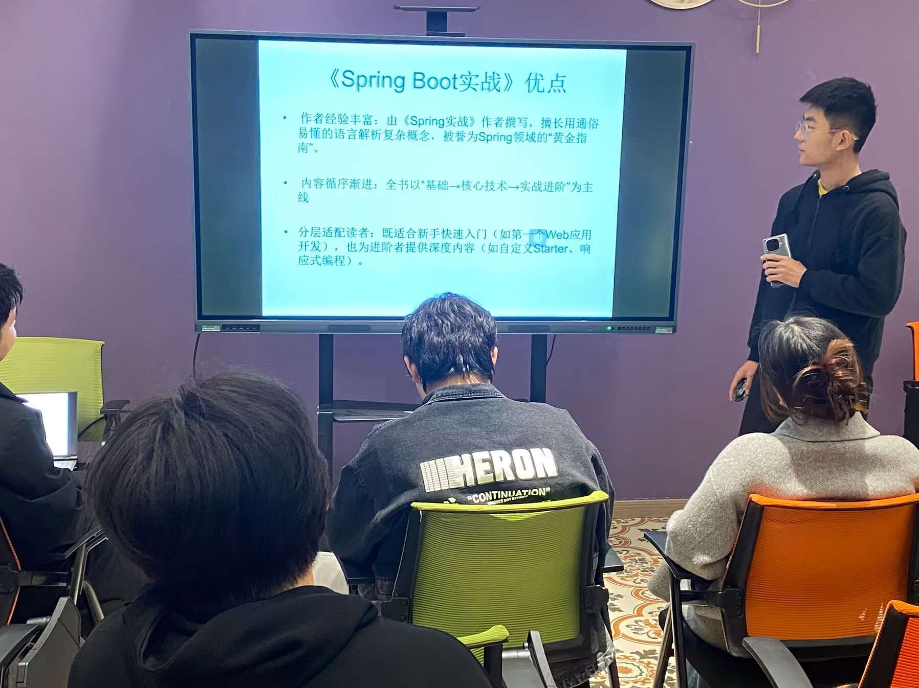 活动伊始,韩世杰同学以《Spring Boot应用开发实战》为主题,结合自身学习经历,深入解析了这本书的独特价值。该书以“实战”为核心,通过丰富的案例和清晰的代码示例,帮助读者快速掌握Spring Boot框架的核心功能,例如自动化配置、模块化开发以及微服务架构设计等。