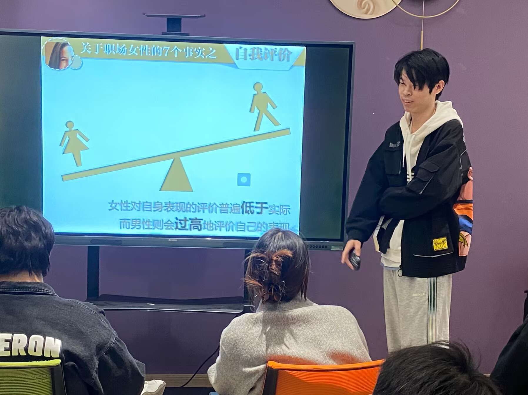 分享中,韩石锋同学特别整理了书中的“力量语录”,如“完成胜过完美”、“如果心无恐惧,你会做什么?”等金句,引发同学们对自我定位与社会角色的思考,结合校园生活呼吁打破性别刻板印象:“无论是技术领域还是管理岗位,女性都应相信自己的潜力,主动争取机会。”这一话题点燃了现场讨论,不少同学表示深受启发。