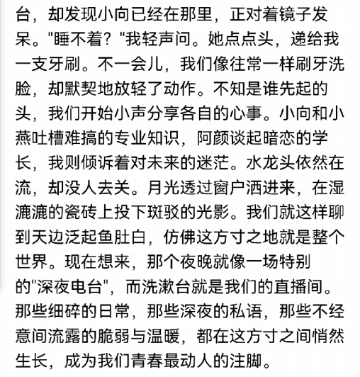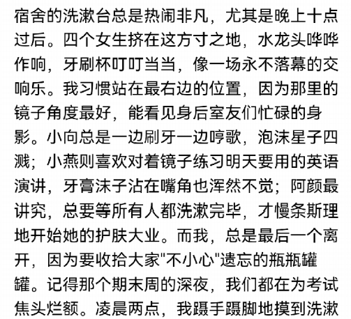 平常吵吵闹闹的寝室变得冷冷清清,九月依旧有人住进这间寝室,只不过不再是之前那批人,虽然平日里同学之间也曾吵过架、闹过矛盾,但彼此之间却也不曾真正地生气。室友之间不仅是伙伴,更是对方生命中某一段旅程的见证者。