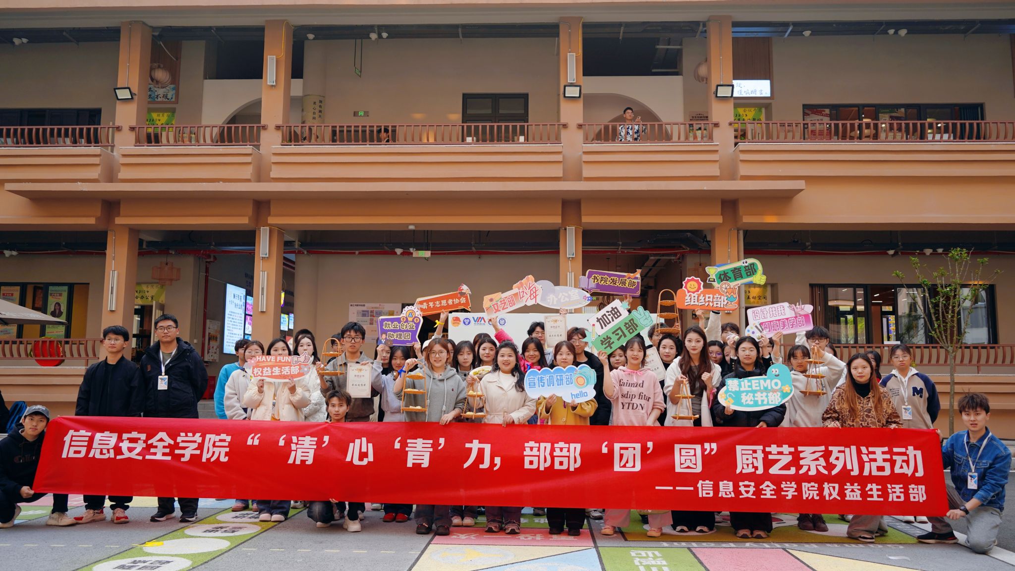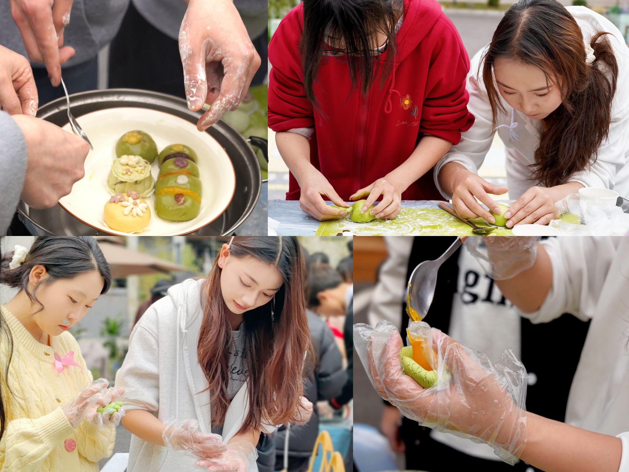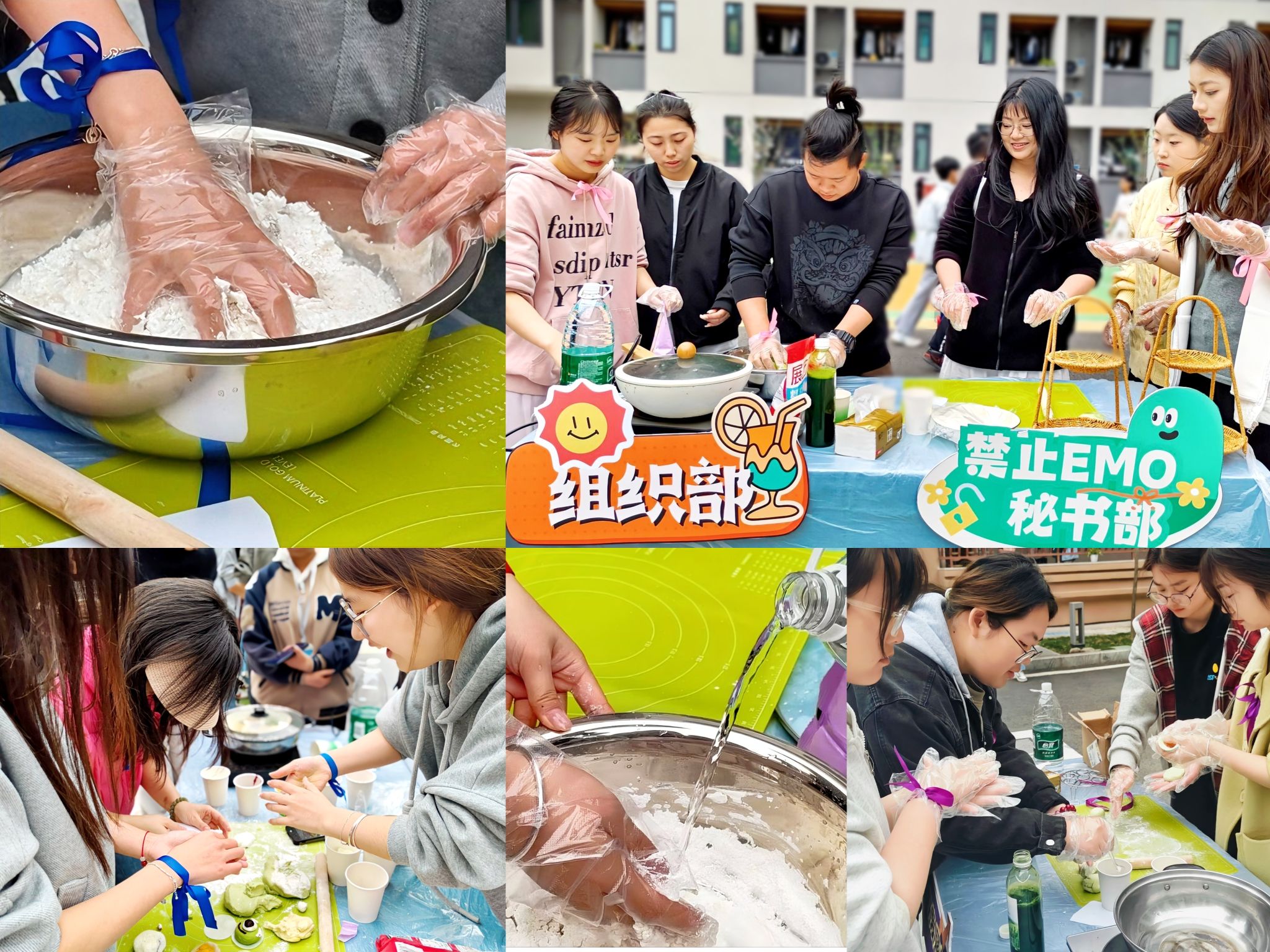 2025年4月2日的下午,春风轻拂,艾草飘香,南江书院中庭内欢声笑语不断,交织成一片暖意融融的春景,由信息安全学院学生会权益生活部主办的“‘清’心‘青’力,部部‘团’”圆主题活动在此拉开帷幕,铺着靛蓝粗布的长桌摆开阵仗,来自不同部门的成员以青团为媒组成六组,让平日里专注于工作的干部干事们,在这里完成了一次“厨房外交”。