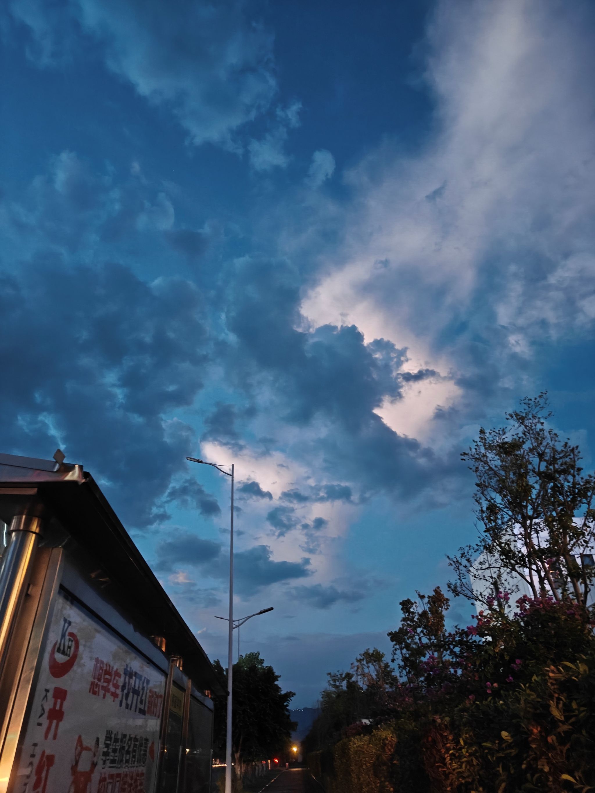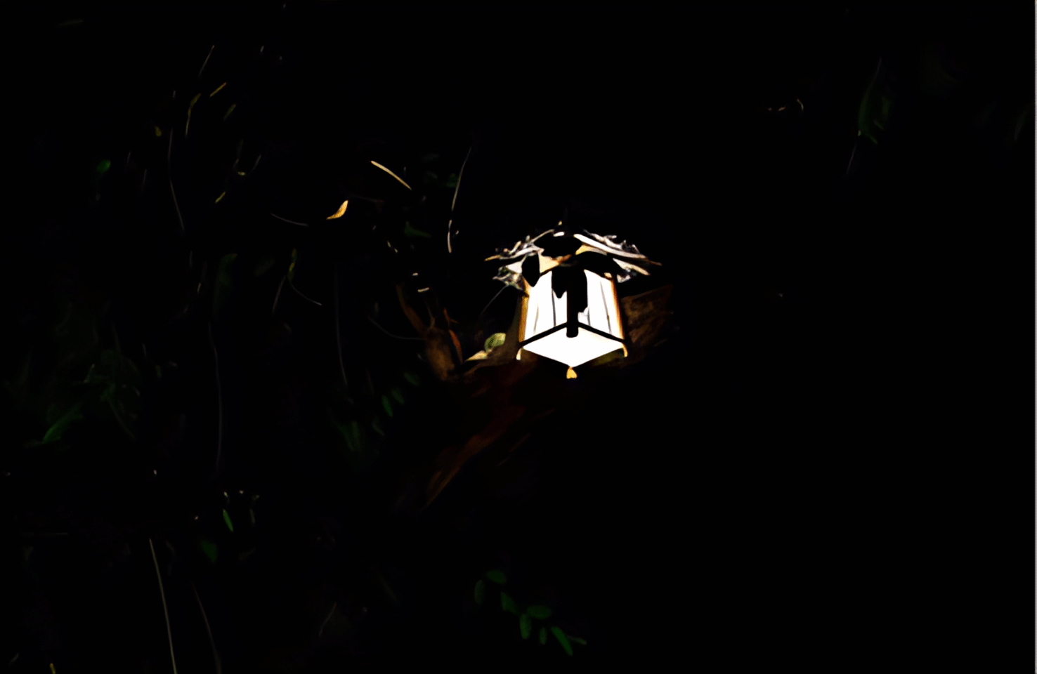 傍晚,吃完晚饭后,我带上相机独自出发登山。进入山中,迎面而来的是一阵阴凉的清风,随着渐渐深入,夕阳缓缓沉入地底。夜晚的山中十分静溢,只有此起波伏的虫鸣,抬头间,树上一盏造型别致的路灯吸引了我的目光,它狐独地悬挂在枝条之间,却散发着温暖明亮的光芒,将周围的绿叶照亮,营造出了些许宁静意味。我举起手中的相机,将这幅画面定格,也许在未来的某一天,当我翻开陈旧的相册,再一次看到这张照片时,依旧能感受到这份静溢与安宁。】
