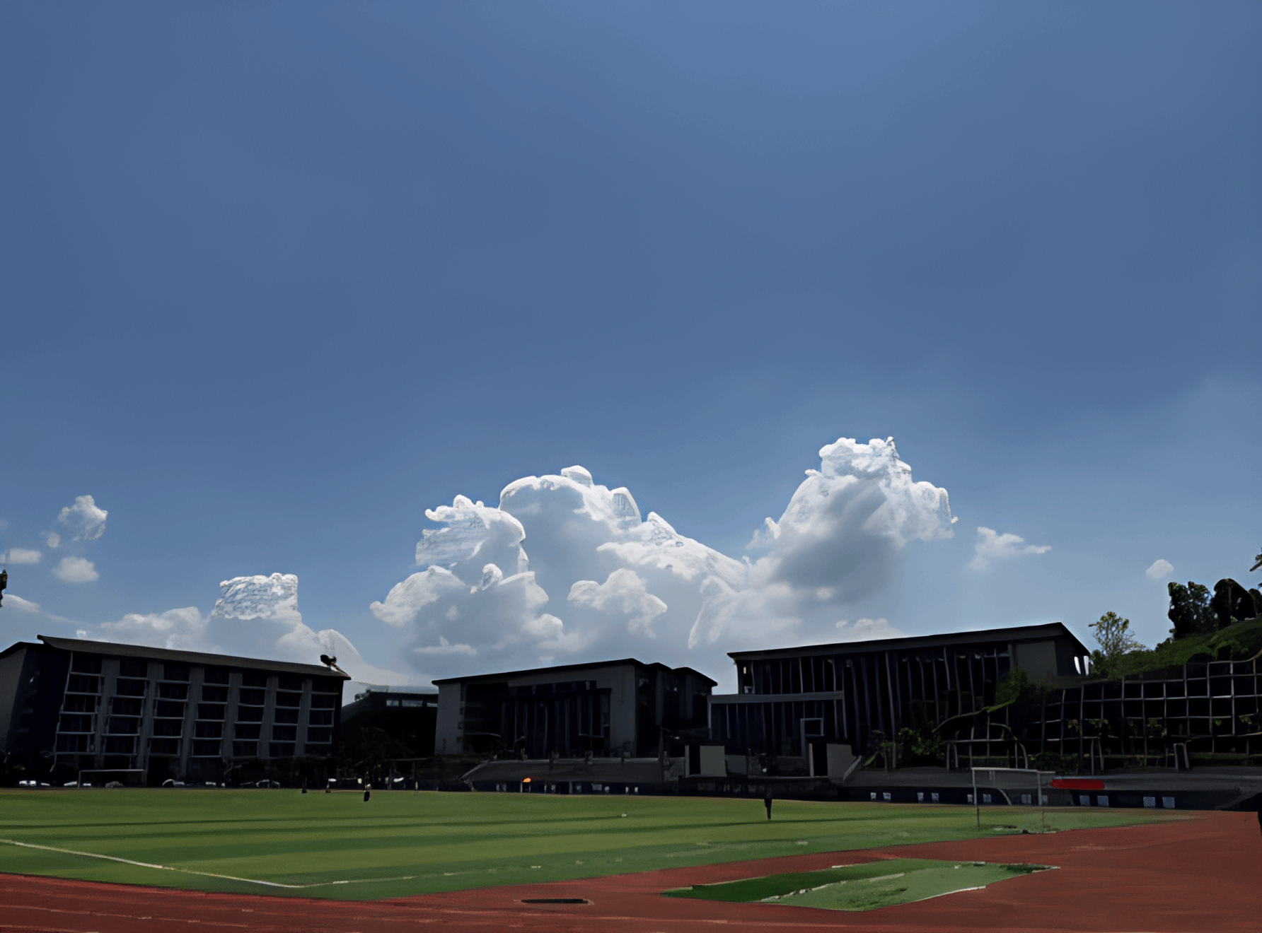 金灿灿的骄阳倾泻在移通操场的绿茵上,橡胶跑道被映得发亮。远处的数学楼在棉花糖般的云团间若隐若现,哥特式尖顶与流动的云影在蓝天下构成几何诗篇。镜头恰好捕捉到一朵胖云,悄然爬上教学楼钟楼的瞬间——像天空正给大地别上一枚会呼吸的胸针。】