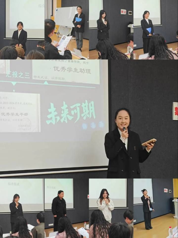 在首轮环节,面试现场气氛热烈,九位选手依序登上发言台,每人都有四分钟的时间,向台下的老师们展示自我。他们有条不紊地围