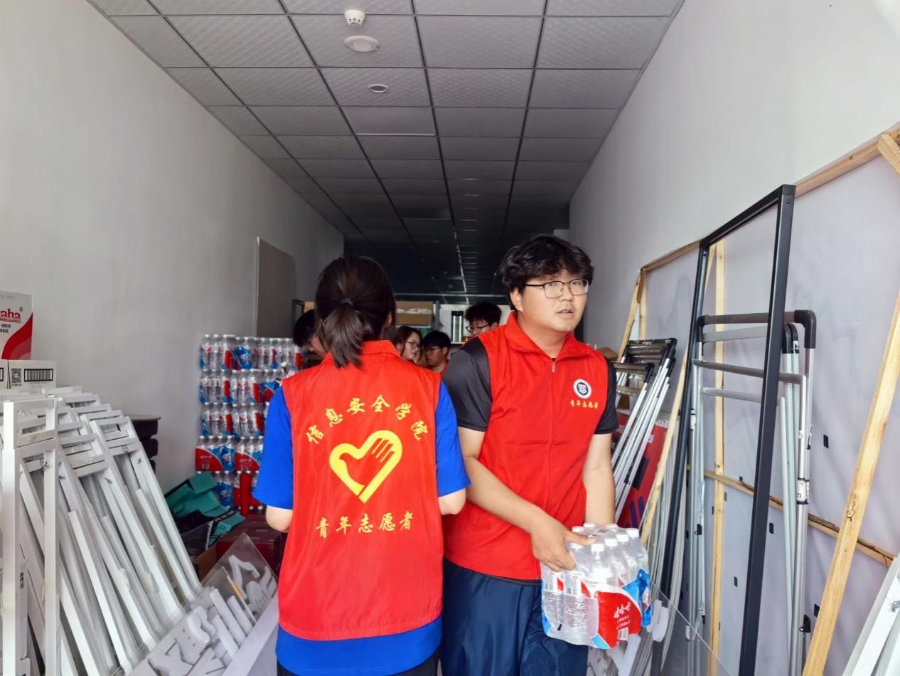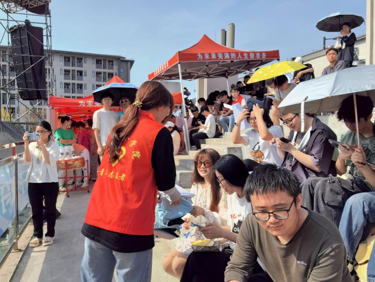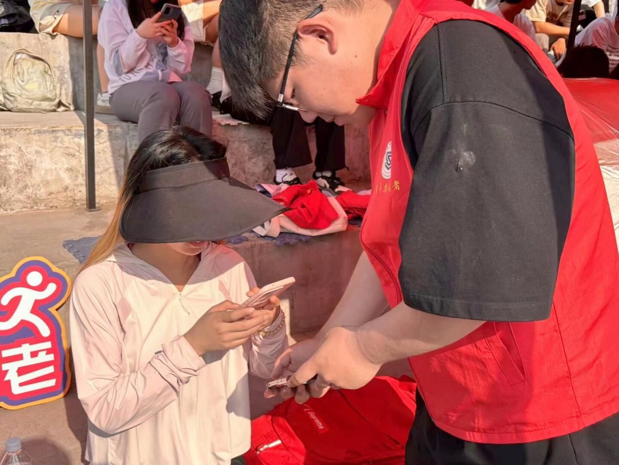 2025年4月17日,当校园还处于沉睡中时,志愿者便已迎着朝霞,怀揣着使命,奔赴学校操场,做好赛前准备。为了给观众带来更加舒适的体验感,志愿者一丝不苟的为观众逐一分发座垫,将信息安全学院的人文关怀传递给每一个人。时光在忙碌中飞逝,运动场内观众逐渐汇聚。志愿者顾不上片刻休息,他们手持签到码,有条不紊的引导观众签到入场,面对观众各种各样的疑问,他们始终面带微笑,眼中满含热忱,用温暖的话语耐心的一一解答,驱散众人心中的疑问。火热的太阳炙烤着大地,汗珠不断顺着志愿者的鬓角滑落,即便如此,她们依然毫不犹豫的将手中唯一的遮阳伞送给观众,自己却在烈日下坚守岗位;一趟趟往返搬运饮用水,为运动员送去清凉补给。尽管高温难耐,却无一人退缩,无一人抱怨,他们用辛勤的汗水谱写着一曲曲动人的志愿服务赞歌。