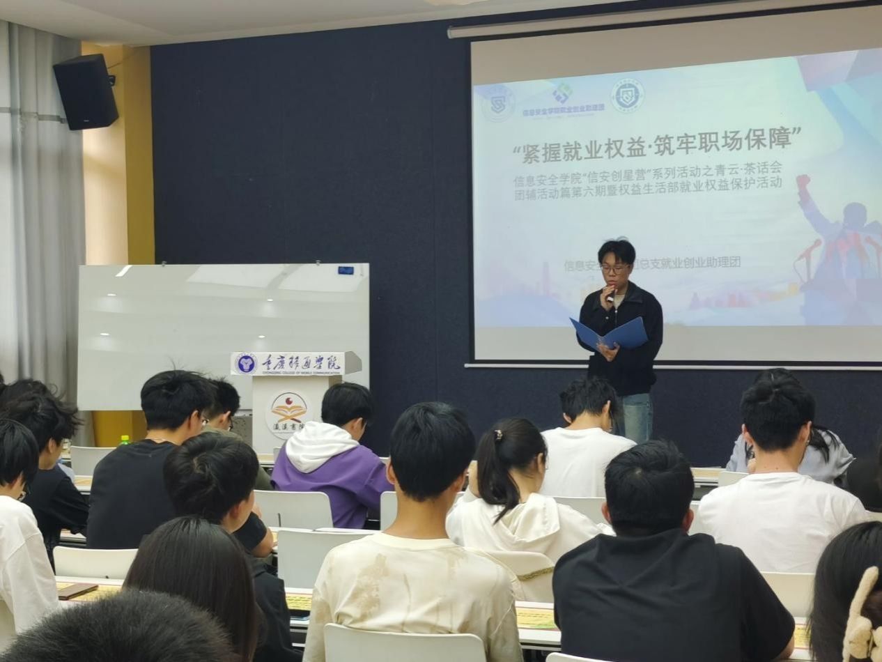 2025年4月23日下午,信息安全学院“信安创星营”系列活动之青云·茶话会团辅第六期暨权益生活部就业权益保护活动在瀛溪书院回声报告厅顺利举行。本次活动由信息安全学院就业创业助理团与学生会权益生活部联合主办,以“紧握就业权益·筑牢职场保障”为主题,特邀资深就业指导专家张雪老师担任主讲人,吸引了50余名学生参与。活动由刘汶鑫同学主持,通过“理论讲解+经验分享+彩蛋抢答”的多元形式,助力学生提升职场法律意识与维权能力。
