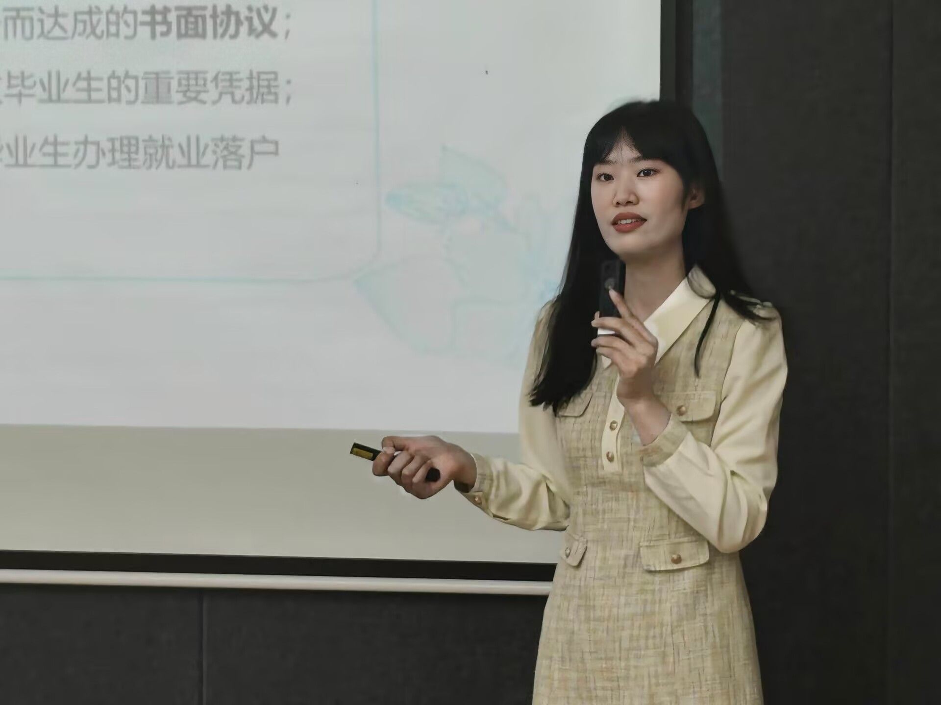 张雪老师以《职场新人权益保护指南》为框架,结合《劳动法》《劳动合同法》等法规,围绕求职签约、薪资待遇、社保缴纳等核心环节展开讲解。她通过“虚假招聘”“试用期陷阱”“竞业限制协议纠纷”等典型案例,深度剖析毕业生初入职场可能遭遇的“合同暗礁”“薪酬缩水”“权益缩水”等风险,并提炼出“三查三问”应对策略: