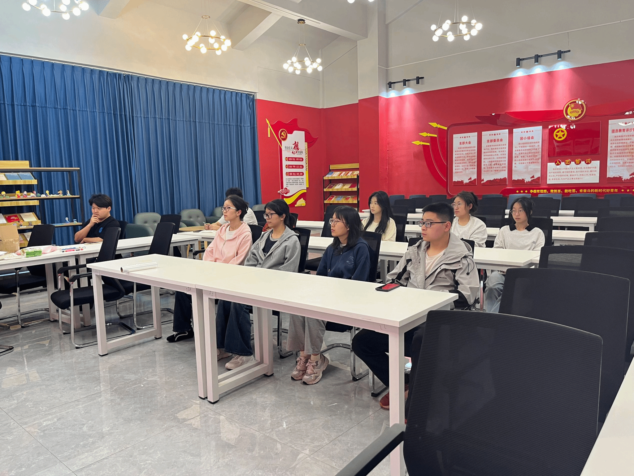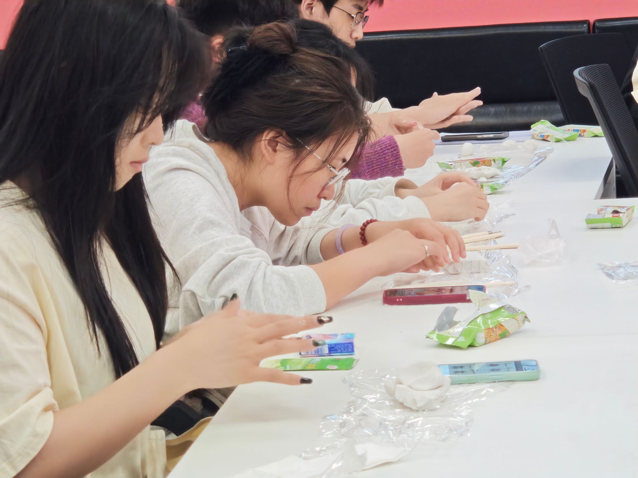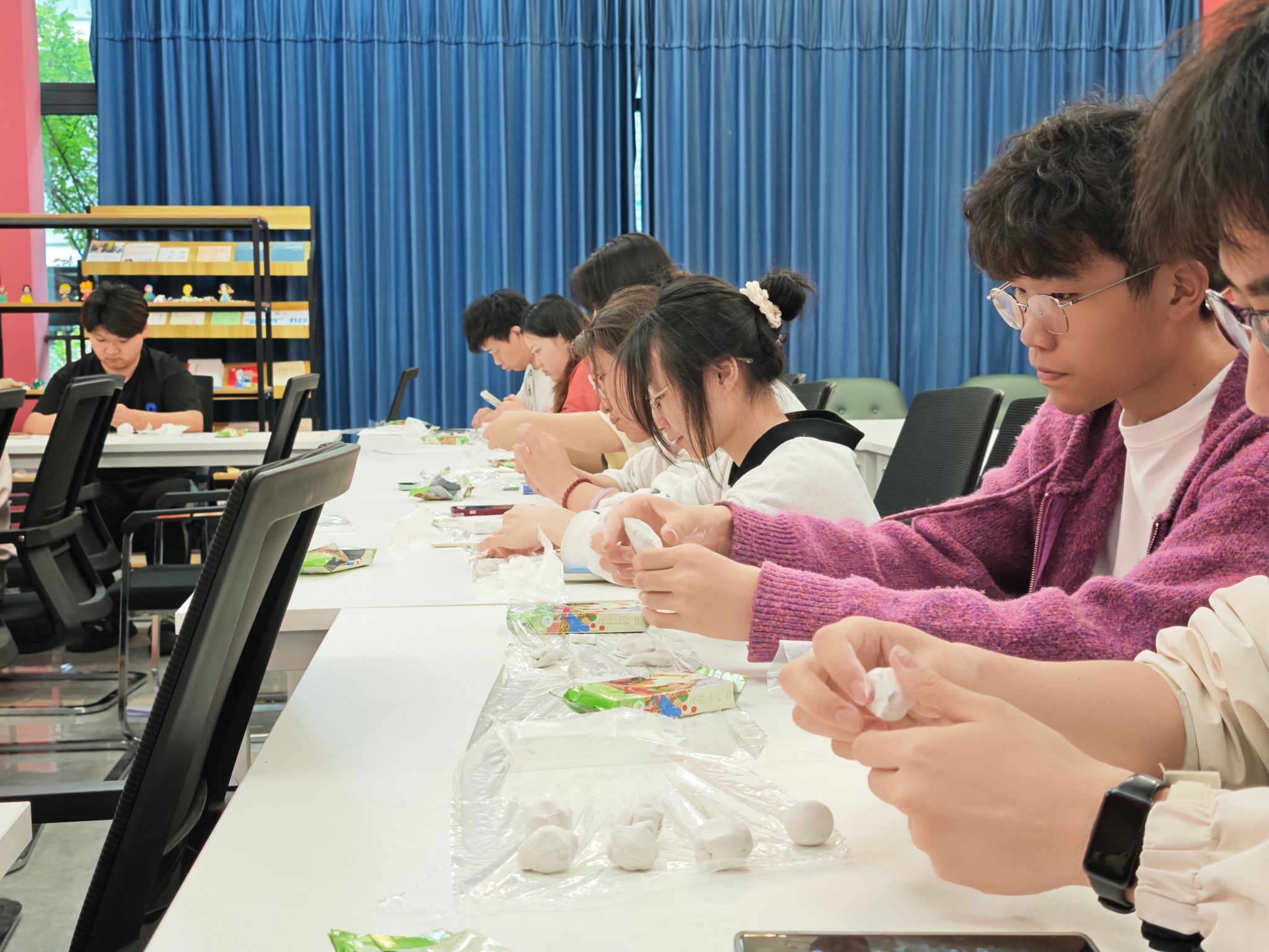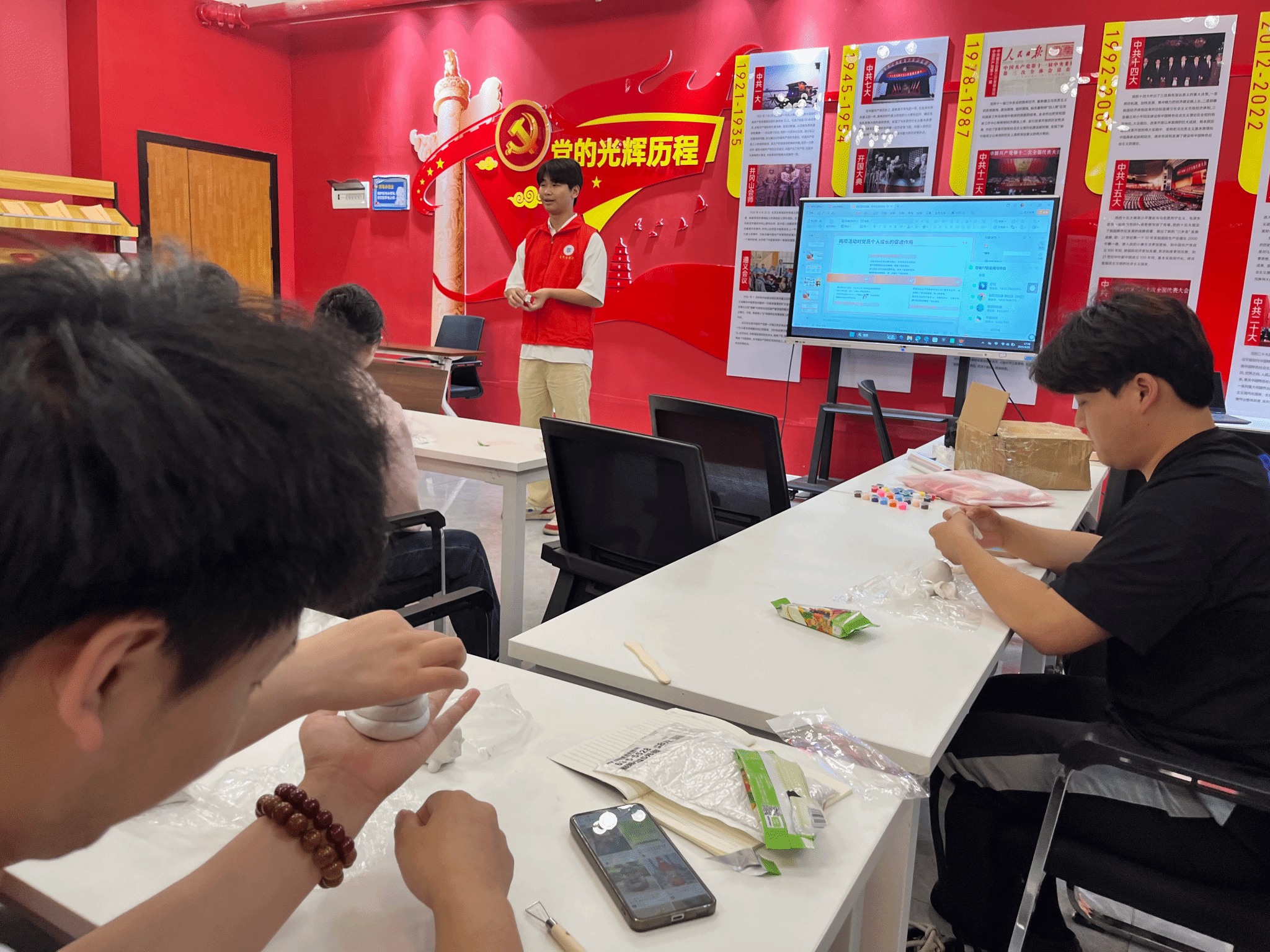 在泥塑创作环节,参与者们热情高涨。他们根据前期主持人讲解内容及讨论成果,或独自构思,或分组协作。现场,同学们互相帮助,及时解决技术难题,主持人鼓励大家发挥创意,大胆构思,将党史元素巧妙融入作品中。现场气氛热烈非凡,大家相互交流、相互配合,现场满是热烈讨论的声音和专注创作的身影。