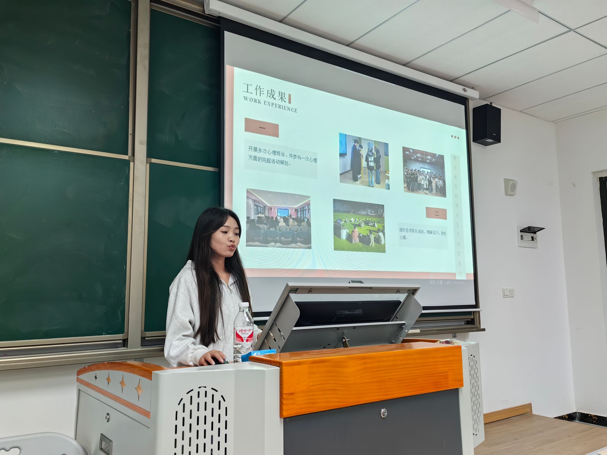 比赛分为两轮进行,第一轮为个人风采展示,参赛选手以“班级心理委员的角色担当”为主线,结合PPT、短视频等形式,生动讲述任职期间的成长故事。从组织“情绪管理,向阳而生”全面覆盖的主题班会,到一对一帮扶学业焦虑的室友;从参加各项心理委员培训提升技能,到深入班级中为同学解决实际困难……选手们以真实案例和详实数据展现工作成果,并围绕未来工作计划提出创新设想,彰显出心理委员“倾听者”“守护者”的双重使命。