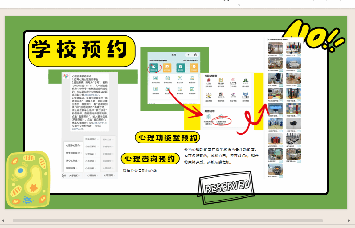 心理援助资源展示环节,心理委员强调:“若思辨引发情绪波动,或需要心理支持,请善用资源。”同时,向同学们介绍学校心理支持资源:情感宣泄功能室、微信公众号彩虹心苑预约心理咨询等。