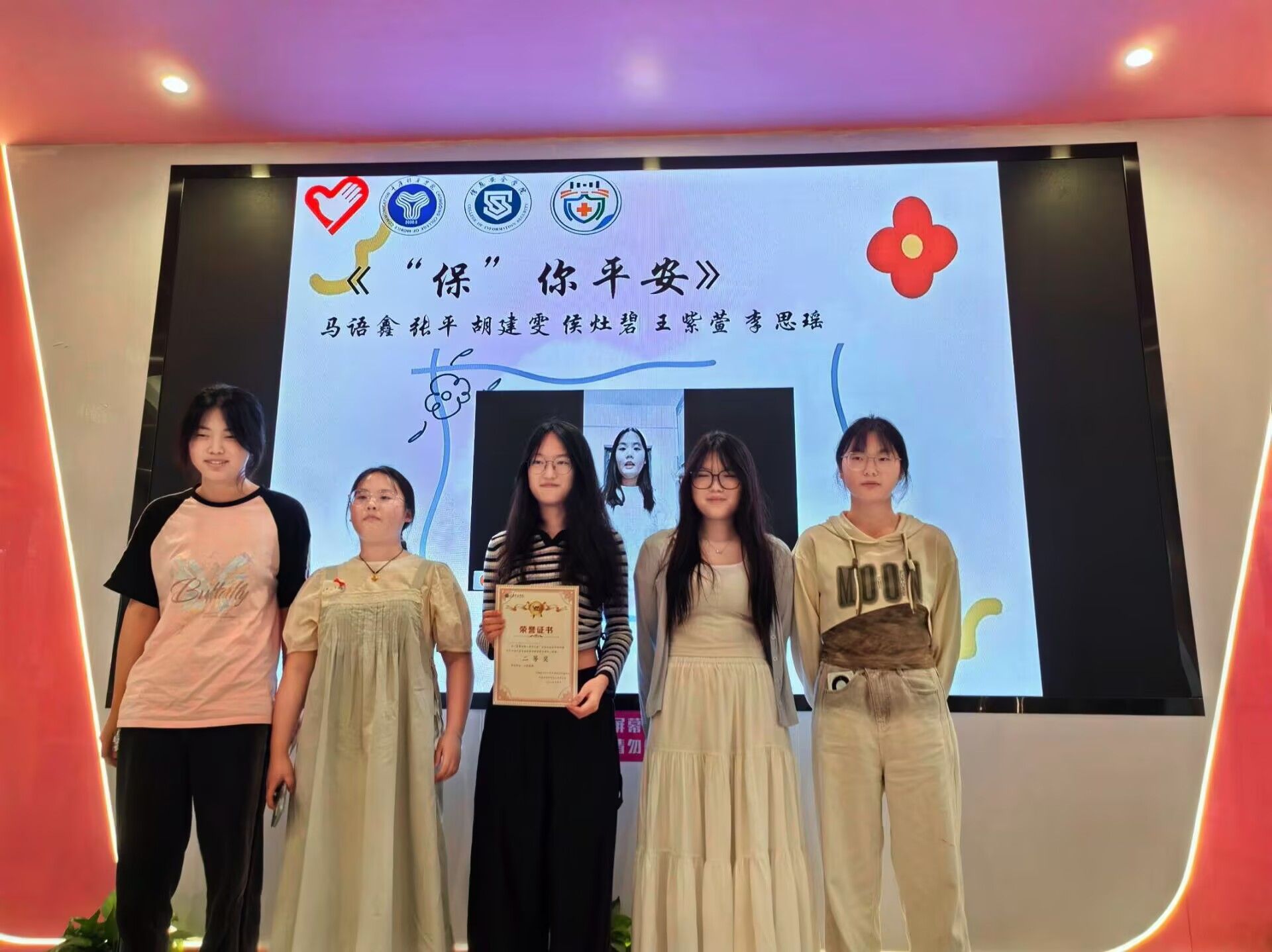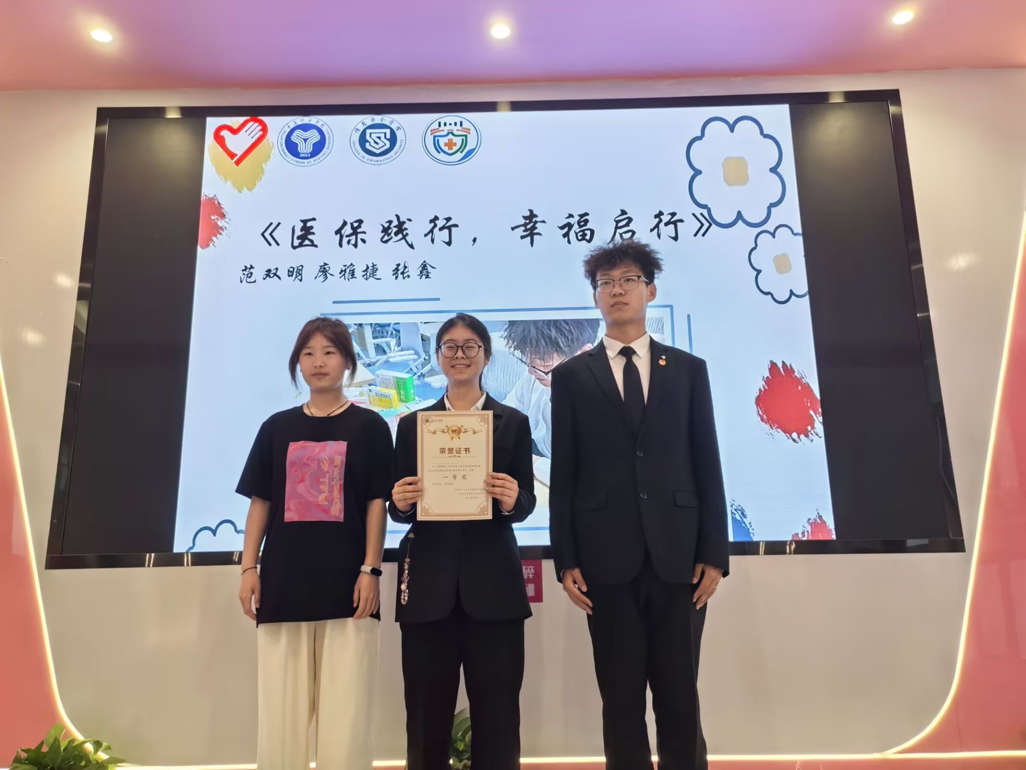 随后,入围决赛的作品依次在荧幕上展示,同学们以生动演绎呈现出医保在生活中的实际运用,引发大家对医保生活的深入探讨。最终,比赛评选出一、二等奖。主持人宣布获奖名单后,为获奖选手颁发荣誉证书并一同合影留念,记录下这一荣耀时刻。