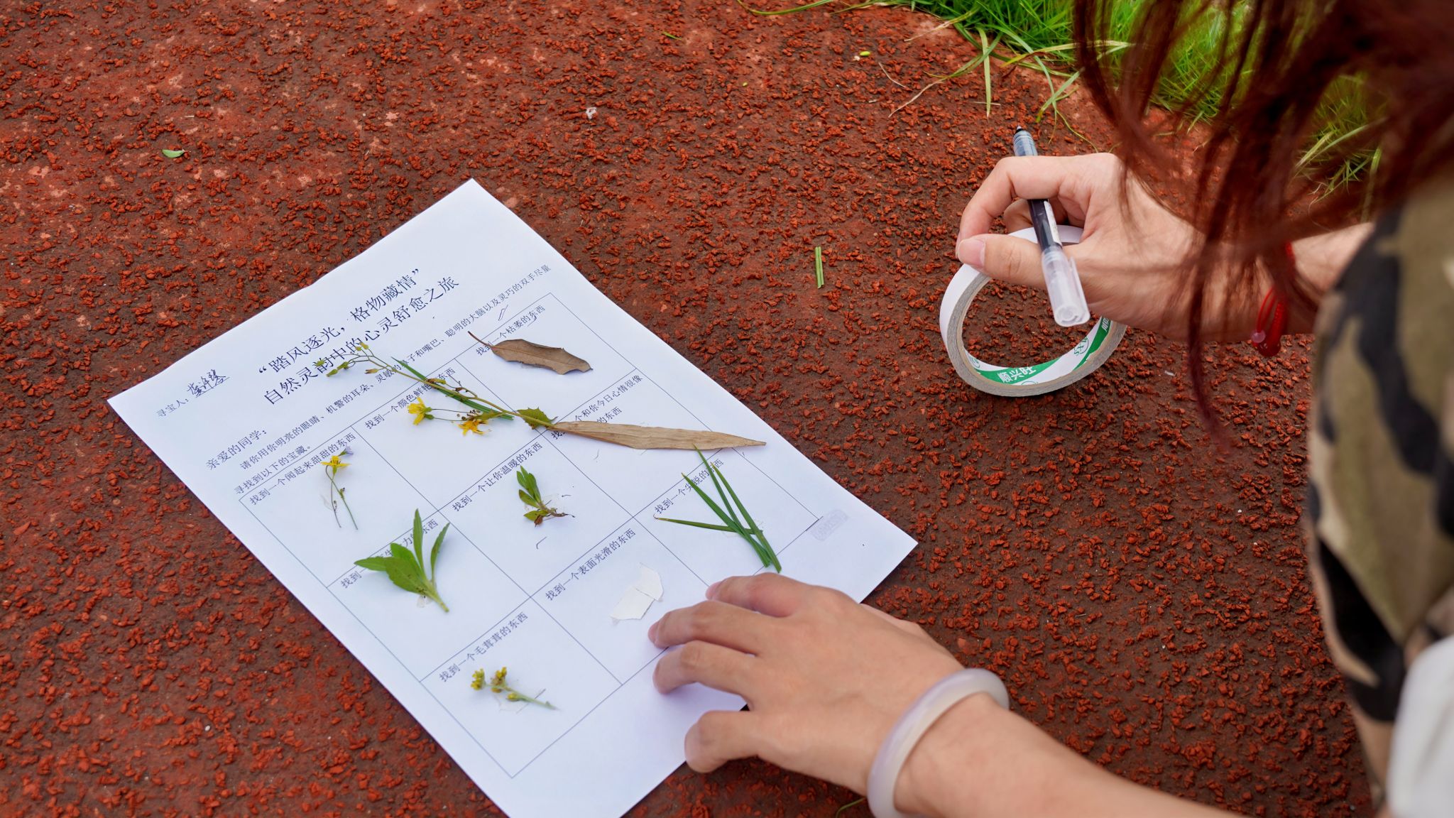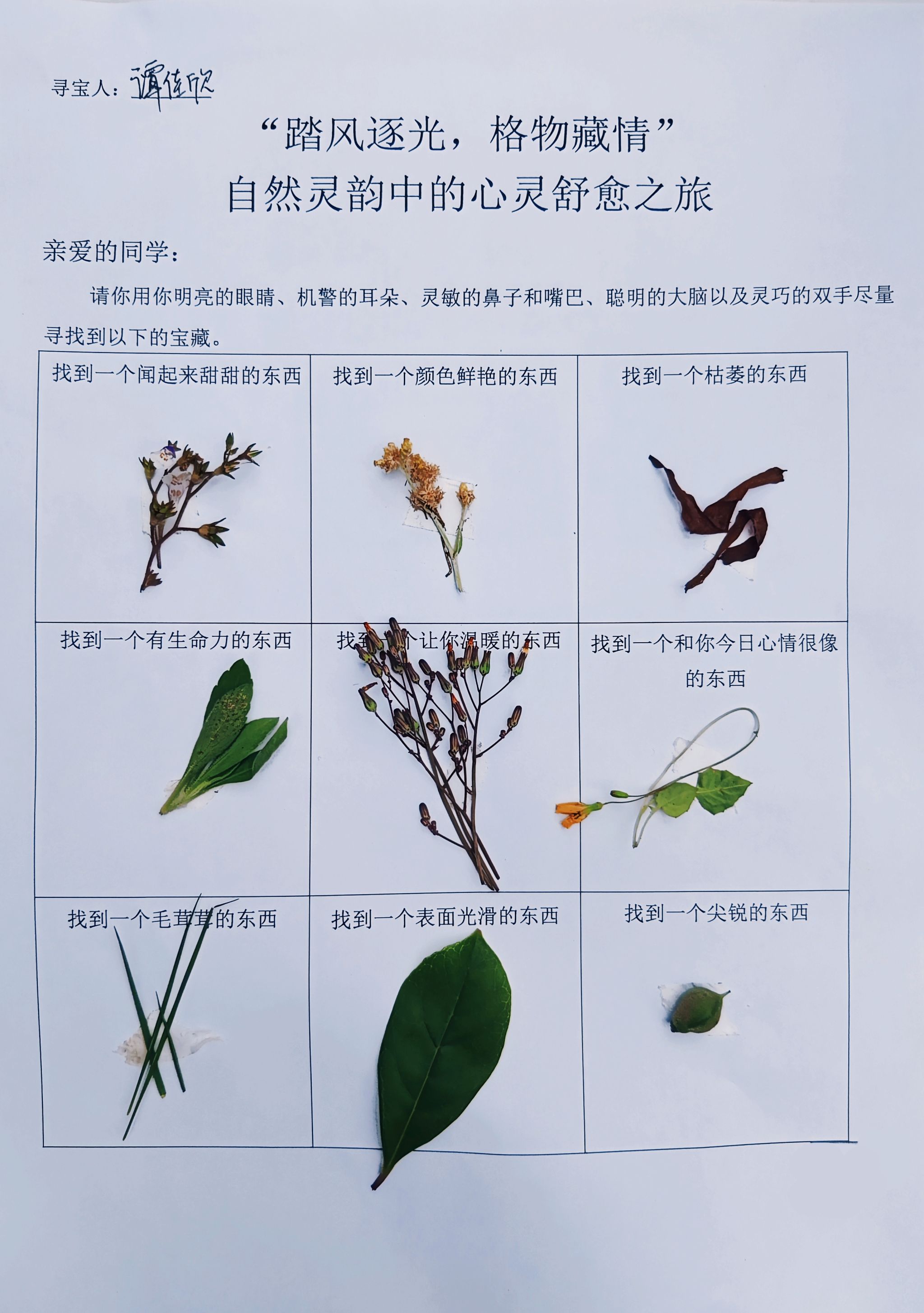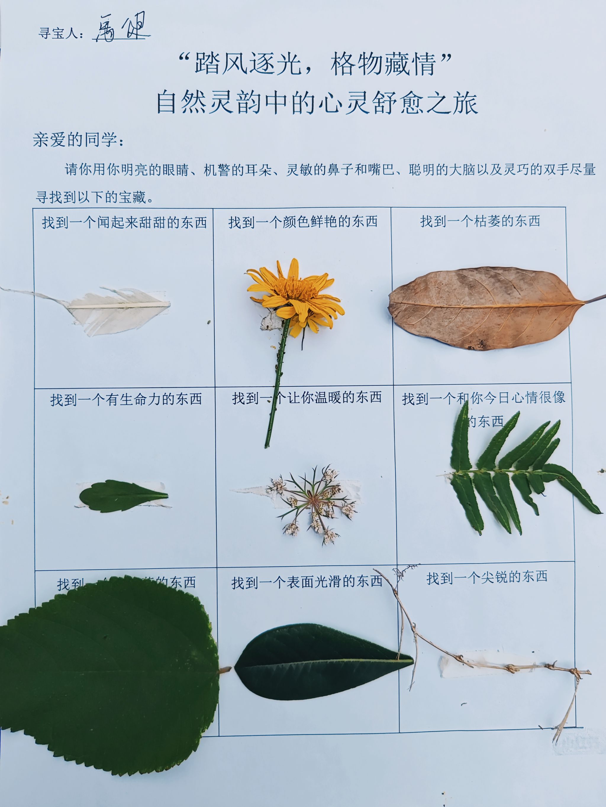 在“踏风逐光,格物藏情——自然灵韵中的心灵舒愈之旅”环节中,同学们化身自然的探索者,手握印有独特寻物要求的A4纸,踏入大自然的怀抱。他们穿梭在花丛与草地之间,细心寻找着符合要求的自然之物。这一过程不仅让同学们释放了学业与生活中的压力,更在与自然的亲密接触中,感受到了生命的韵律与节奏。通过观察与感悟,同学们于细微之处洞察内心,探寻着本真的自我,收获了一份来自自然的宁静与治愈。