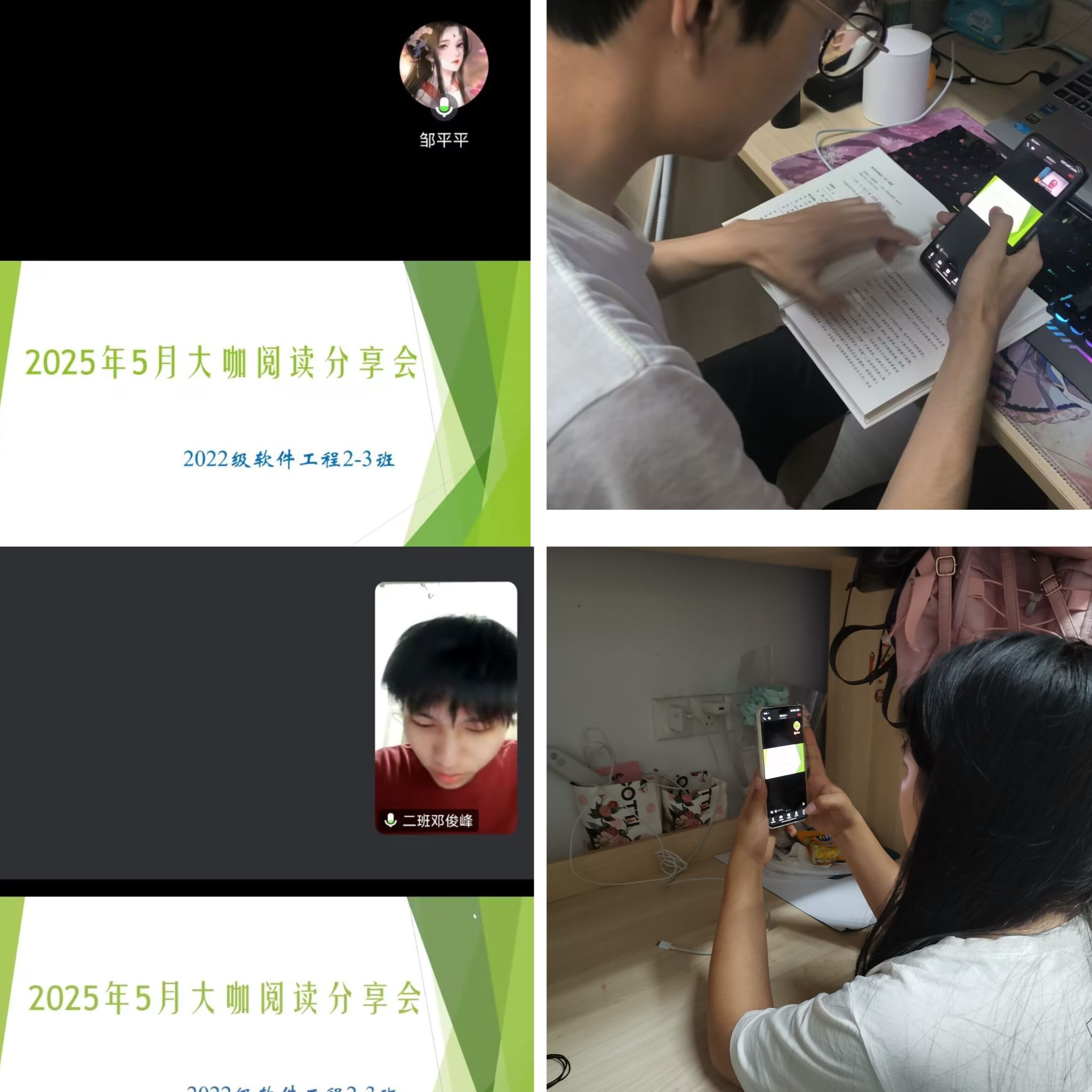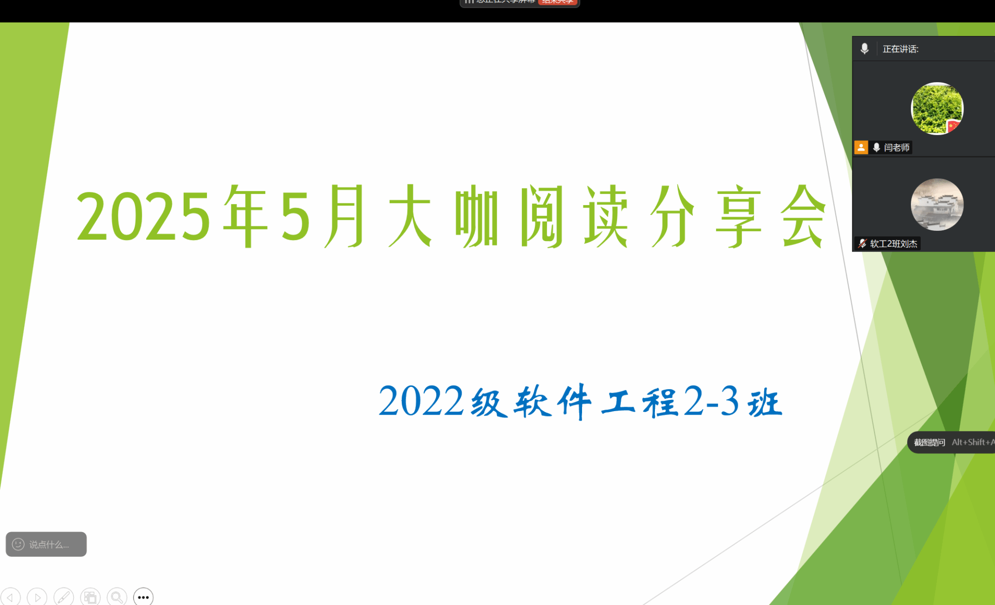2025年5月11日星期日晚上八点半,一场别开生面的大咖阅读线上分享开始,异科生导师闫春娟老师主持,2022级软件工程2、3班20几名同学积极参与。杨玲玲、邓俊峰、邹平平三位同学化身 “阅读引航员”,从文学、科幻、商业三大领域切入,带领大家开启了一场跨越时空的思想之旅。