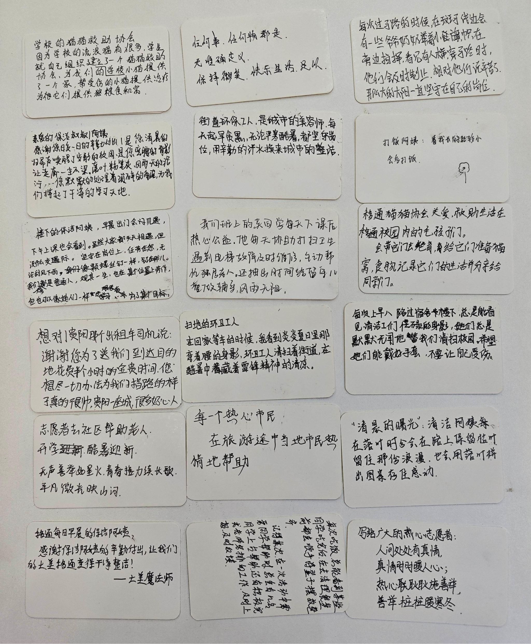 知识问答环节结束后,进入“写卡·寻找微光”环节。同学们纷纷拿起笔,在卡片上认真书写自己身边“微光雷锋”的故事。这些故事的主人公都是身边平凡岗位上的普通人,有默默打扫校园卫生的环卫工,有日夜坚守岗位保障师生安全的保安,有耐心教导学生的教师,还有贴心服务的食堂阿姨等等。一位同学在卡片上写道:“每天清晨,当我们还在睡梦中时,环卫阿姨就已经开始清扫校园的每一个角落。无论是烈日炎炎还是寒风凛冽,她们从未间断,用自己的辛勤劳动为我们创造了干净整洁的学习环境,她们就是我身边的‘微光雷锋’。” 这些质朴的文字,饱含着同学们对身边“雷锋式”人物的敬意与感激。