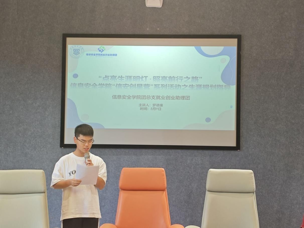 为帮助参与者精准定位个人兴趣、优势与职业目标,清晰规划职业发展路径、提升自我认知与规划能力。2025年5月9日下午14:00,信息安全学院团总支就业创业助理团在古剑书院·龙泉会议室开展“点亮生涯明灯·照亮前行之路”信息安全学院“信安创星营”系列活动之生涯规划指导,本次活动邀请到罗德康老师,共计10人参与,由魏高鹏同学主持。