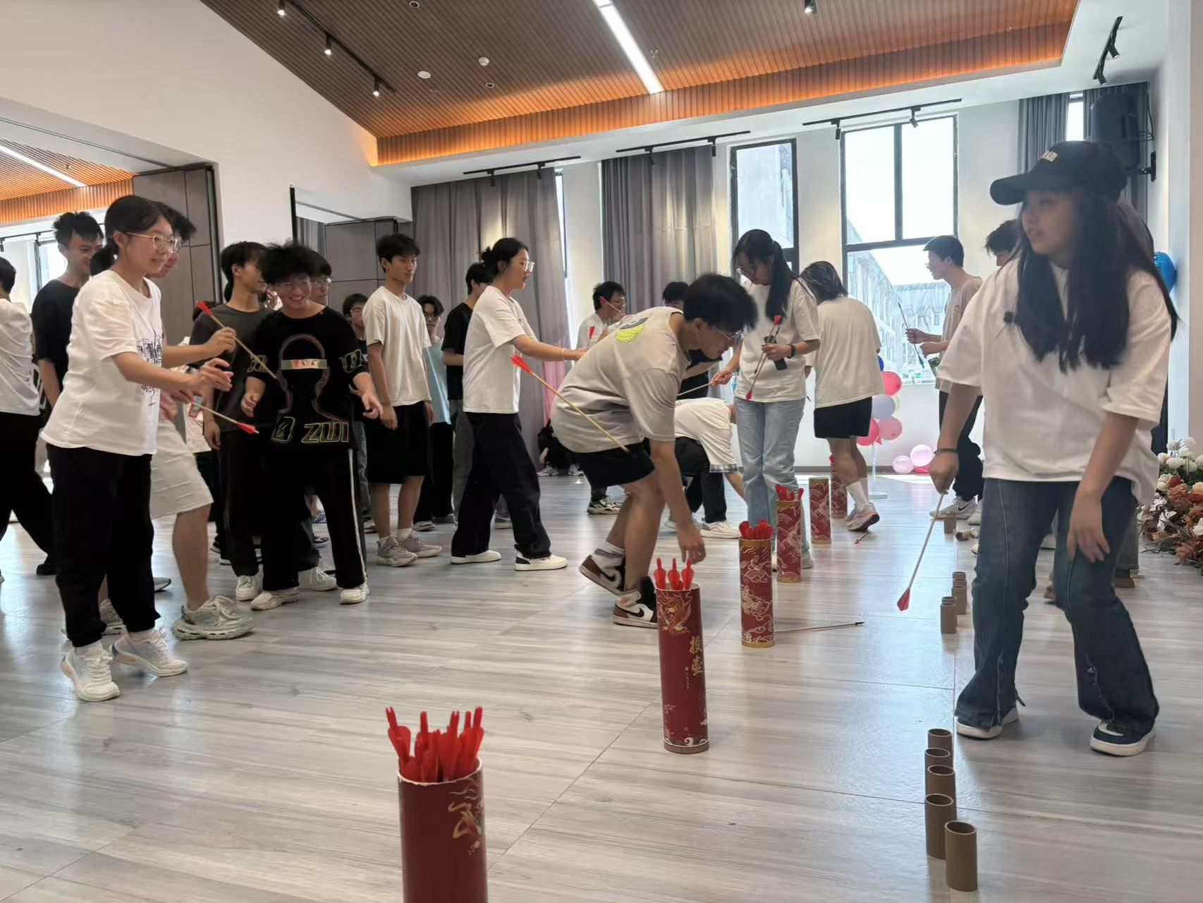 投壶作为古代宴饮中的礼仪雅戏,原以“正身修心”为宗旨。本次活动中将其改造为团队协作挑战赛:参赛者需在2-3米外的投壶线后依次投掷箭矢,身体越线则视为无效。最终以小组将全部箭矢投中的时间决胜负。