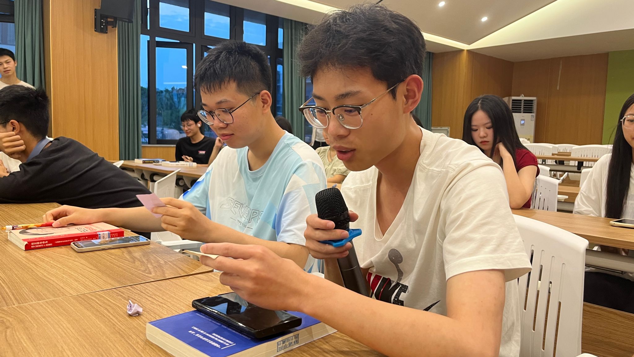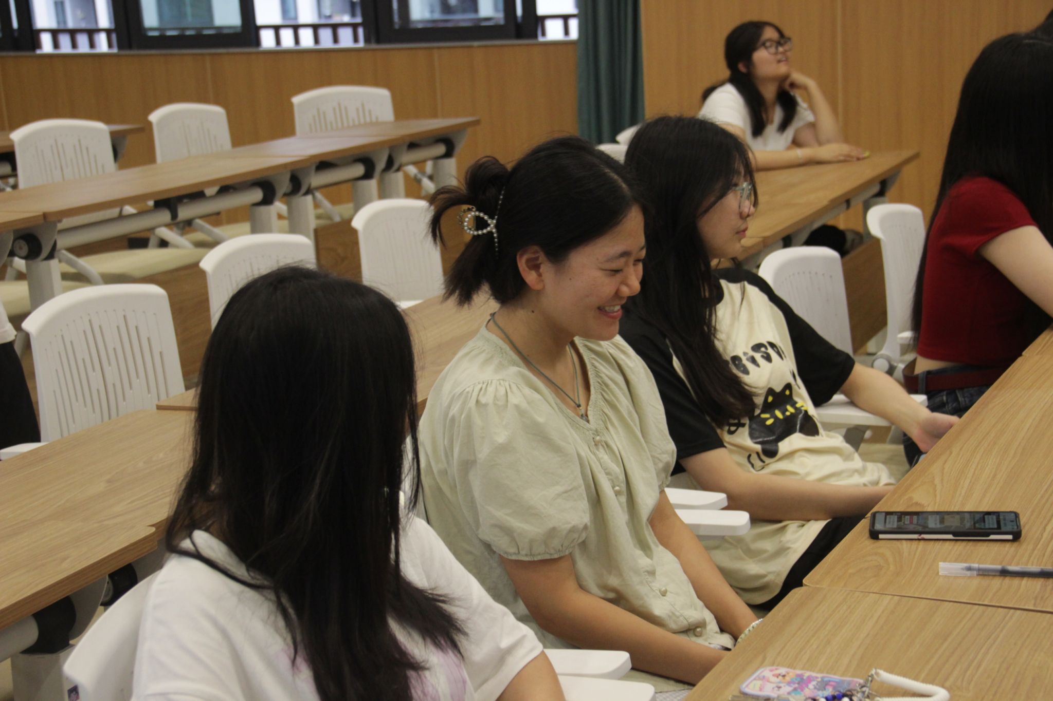 主持人邀请同学们分享自己的“心理小妙招”。大家踊跃发言分享自己的解压技巧。其中一个说:“我会写日记,把烦恼写出来,心里就轻松多了。”另一名同学则推荐了运动解压法:“跑完五公里,烦恼全清零!”同学们的真诚分享让现场充满了温暖与正能量,大家在交流中互相学习、互相启发,共同探索应对心理压力的方法。