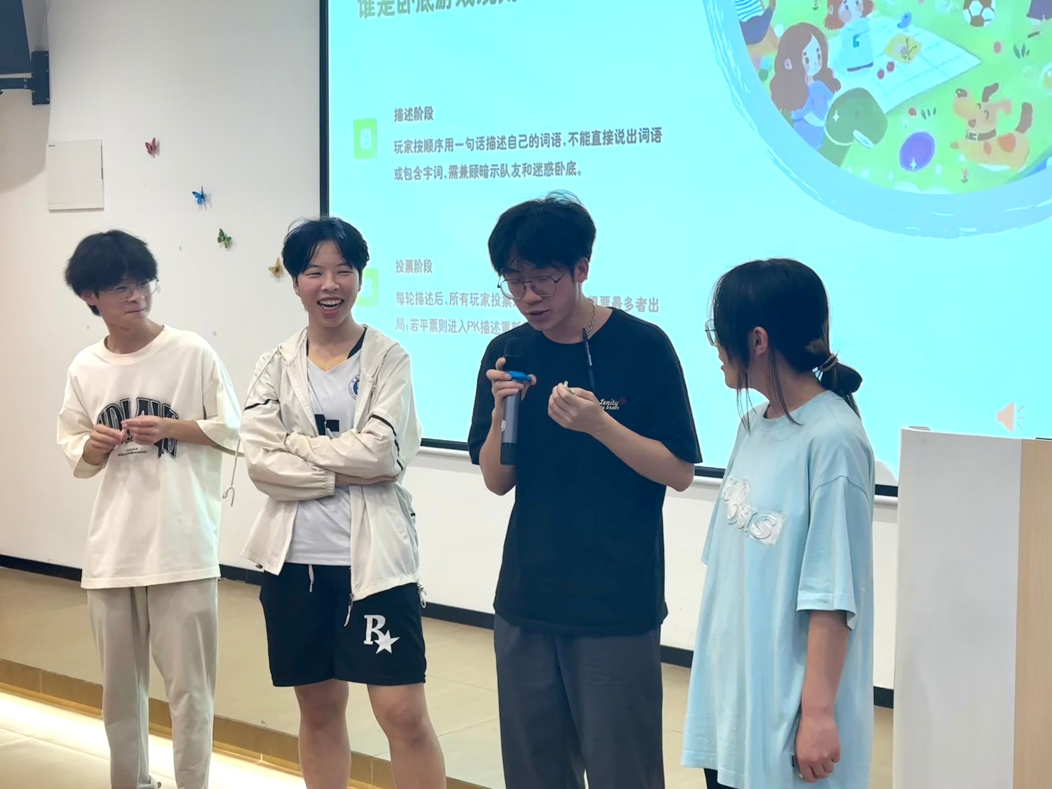 作为开场活动,“谁是卧底”游戏迅速拉近了同学们的距离。大家分成六组,每组通过描述手中的关键词来猜测“卧底”是谁。软件工程八班的同学凭借敏锐的观察力,连续三轮识破“卧底”,引得全场欢呼。而五班的同学则因为一次“离谱”的描述被大家调侃为“卧底专业户”,现场笑声不断,同学们在轻松愉快的氛围中开启了本次班会之旅。