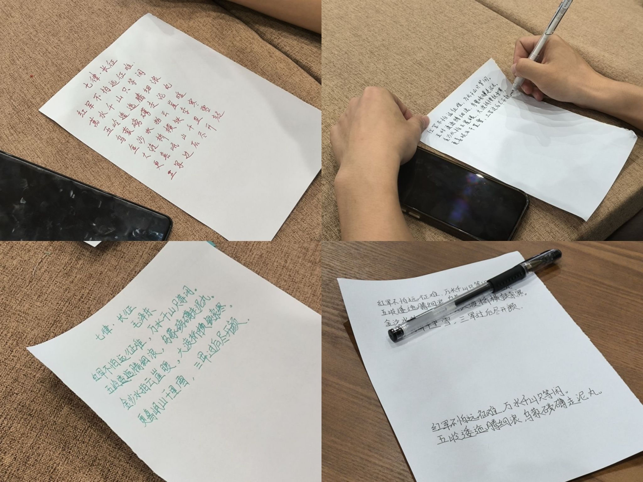 笔墨传情环节以《七律·长征》为主题展开创作。同学们提笔书写“红军不怕远征难,万水千山只等闲”的豪迈诗句,在一撇一捺间感受革命先辈跨越雪山草地的坚韧意志。笔锋流转处,“更喜岷山千里雪,三军过后尽开颜”的磅礴气势跃然纸上,墨香与红色精神在宣纸上交融激荡。每写一个字,都仿佛看见红军战士迎着风雪跋涉的身影。雷子腾同学在交流中感慨:“新时代的长征路上,我们更要发扬这种迎难而上的精神。”