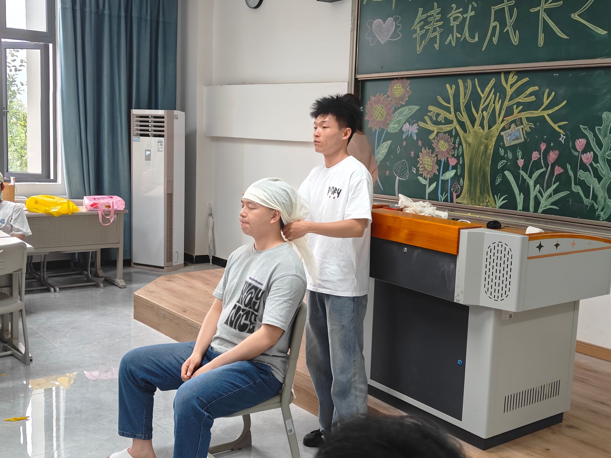 本次班会特别邀请 2022 级通信工程专业、红十字会救护员宋东鹏学长现场讲解演示“三角巾头部包扎法”“绷带螺旋包扎法”,并让同学们随机组队进行包扎演练,让同学们明白危机时刻如何为生命争取黄金时间,掌握应急技能,领悟生命在困境中的坚韧力量。