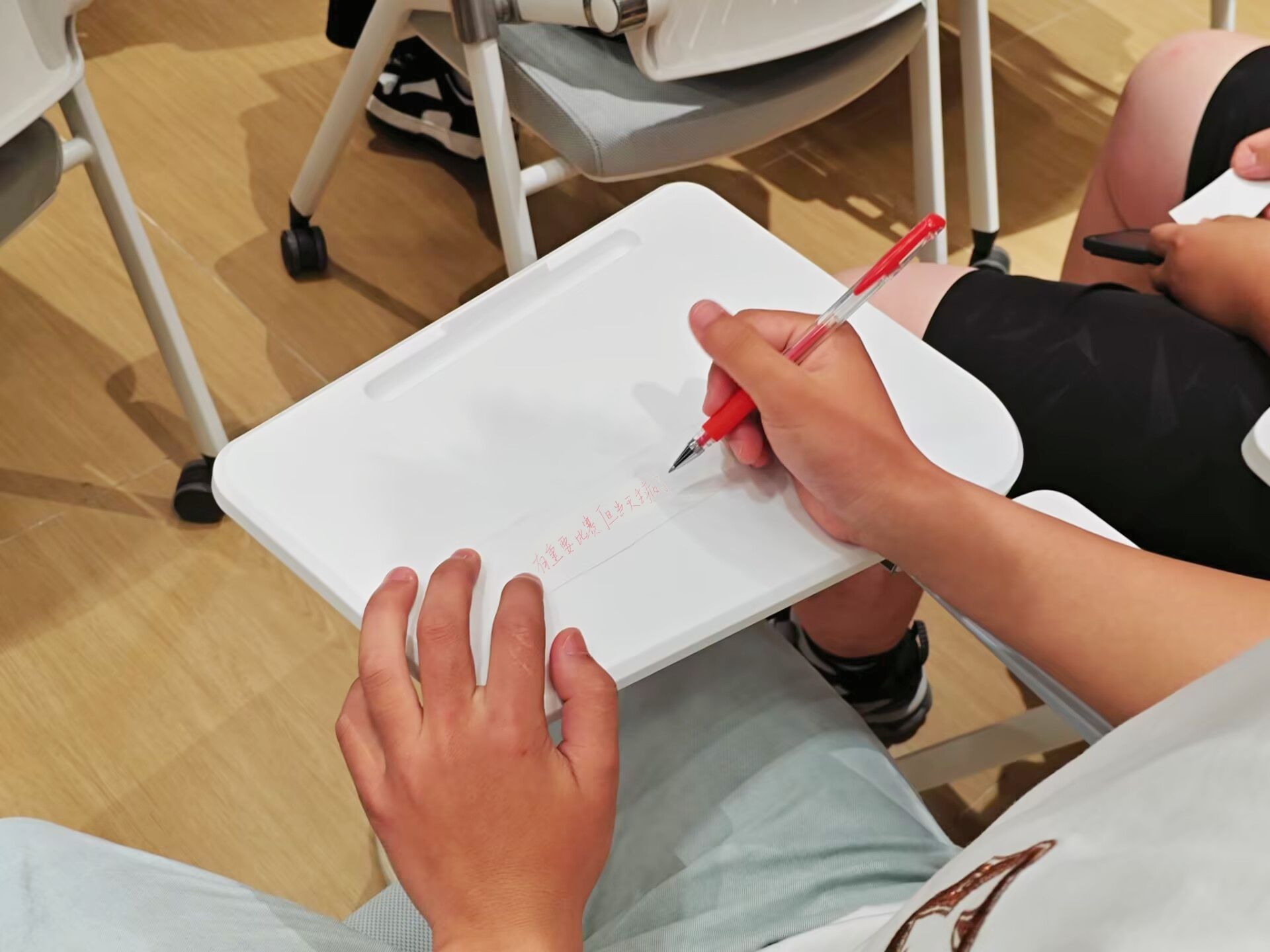 活动伊始,同学们在纸条上认真写下成长道路上曾经遇到的困难,他们将纸条放入盒子中。随后,同学们踊跃举手,上台抽取纸条并分享自己的应对策略。在思想的碰撞中,加深了彼此的了解,在他人的故事中学会用同理心去感受问题,用智慧去解决问题。