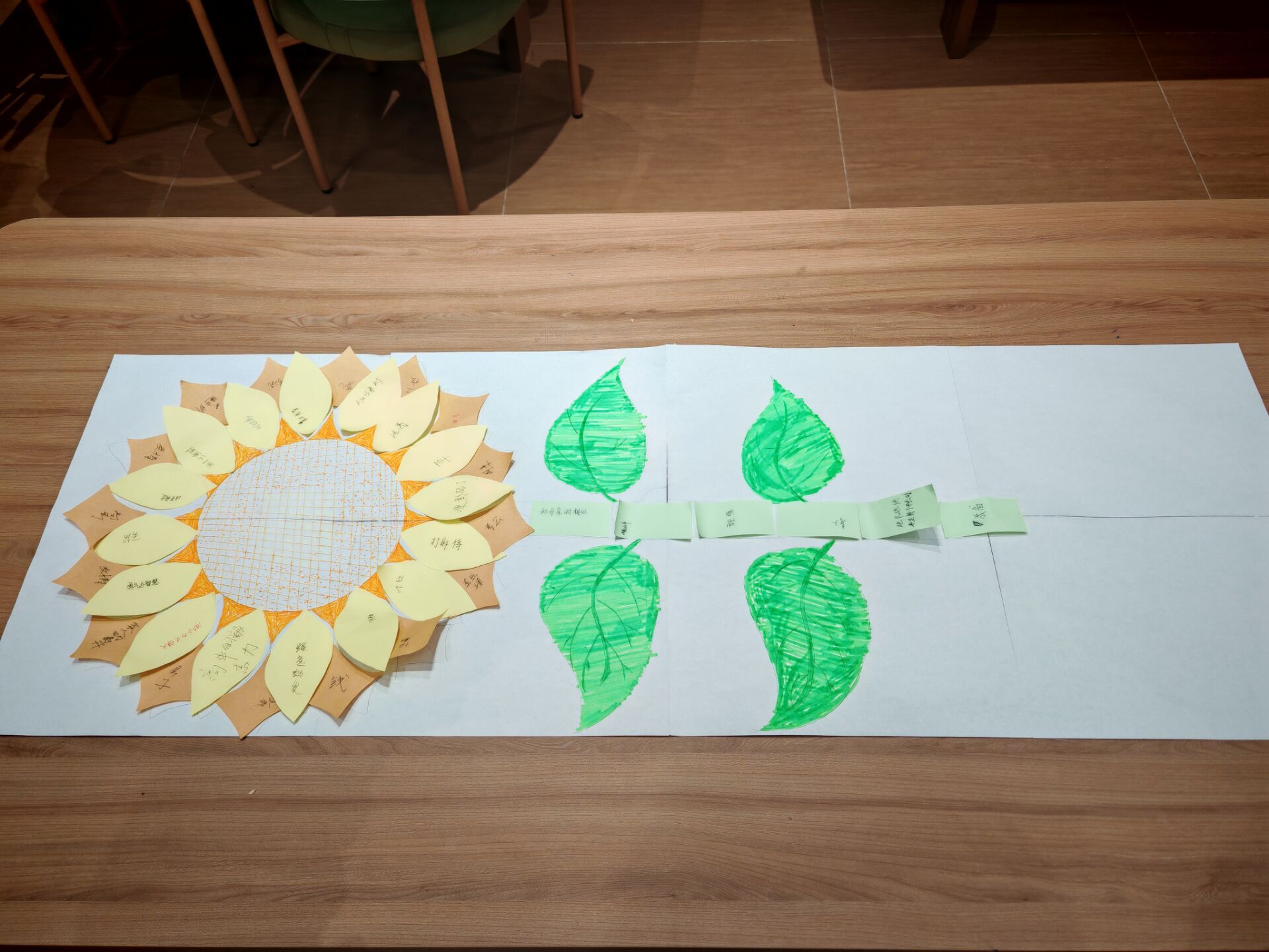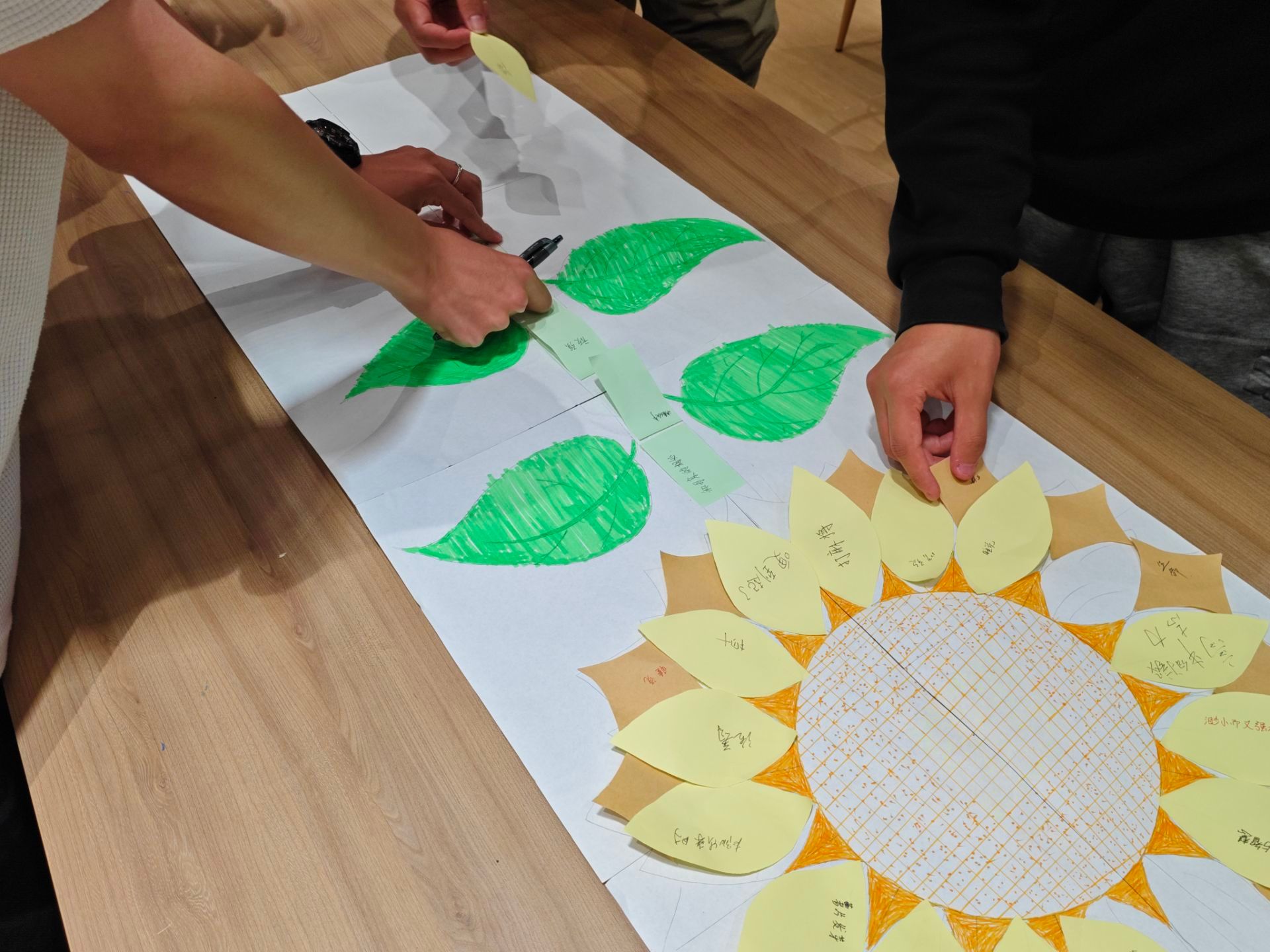 在励志视频观看环节,视频中普通人勇敢地和命运抗争深深触动大家。视频结束后,同学们深受鼓舞,纷纷将对“生命的力量”的理解写在便签上,贴在绘有向日葵的纸上,共同创作出一幅充满希望的向日葵图案。一张张便签纸,展现了同学们对生命的理解和对生命力量的积极向往。