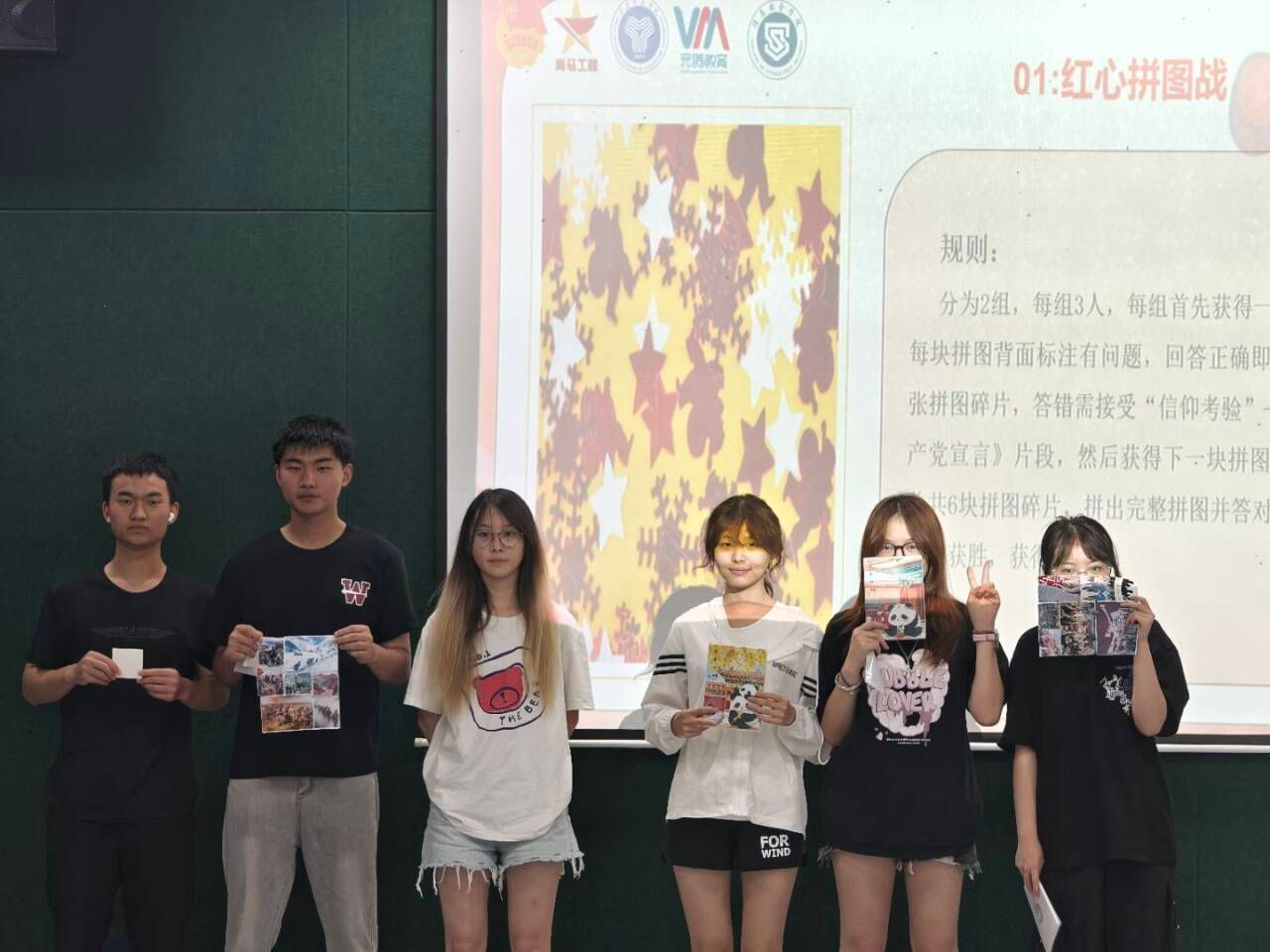 “红心拼图战”融合党史知识问答与拼图游戏,同学们分组竞赛,答对得拼图碎片,答错则有感情的朗诵《共产党宣言》片段,接受信仰考验。比赛激烈进行,现场氛围热烈,同学们通过简单的游戏既了解许多历史知识,又感受到了《共产党宣言》的庄严与激昂,让同学们心中的那片红色更加鲜艳、靓丽。