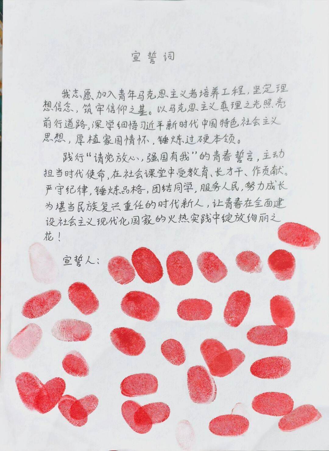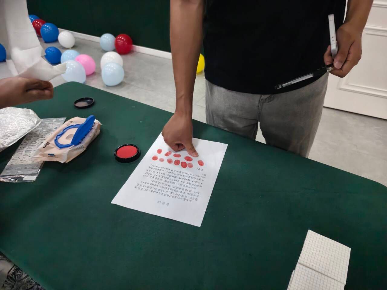 活动开场,同学们有序排队,在写有红色宣誓词的白纸上庄重地按下红手印完成签到。红手印与宣誓纸的交融,成为爱党爱国思想的生动映照,也是同学们对自身的郑重承诺与严格约束。在这一过程中,大家仿佛与先辈们的红色精神产生了跨越时空的共鸣,心中对红色基因的敬畏与认同愈发强烈,为整个活动奠定了浓厚的红色基调。