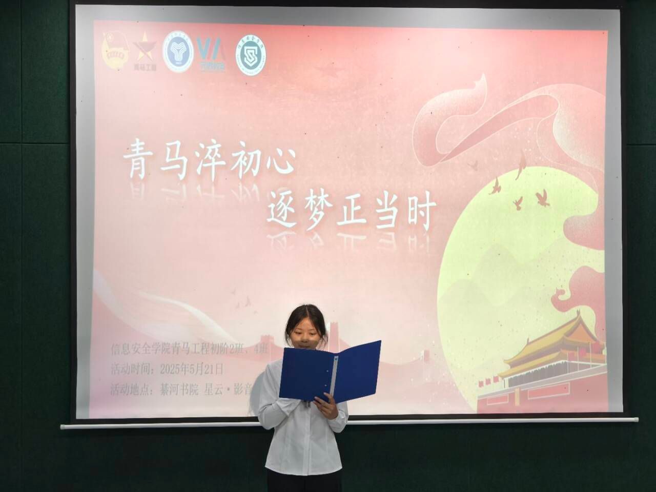 2025年5月21日,重庆移通学院信息安全学院青马工程初阶2班与4班在綦河书院星云·影音室,成功举办了“青马淬初心,逐梦正当时”主题活动。本次活动通过实践游戏互动、红色教育等形式,紧扣青马工程教育初心,旨在培养同学们坚定的马克思主义信仰,练就过硬的本领,在时代浪潮中敢想敢为,始终为党和国家事业发展奋斗终身。