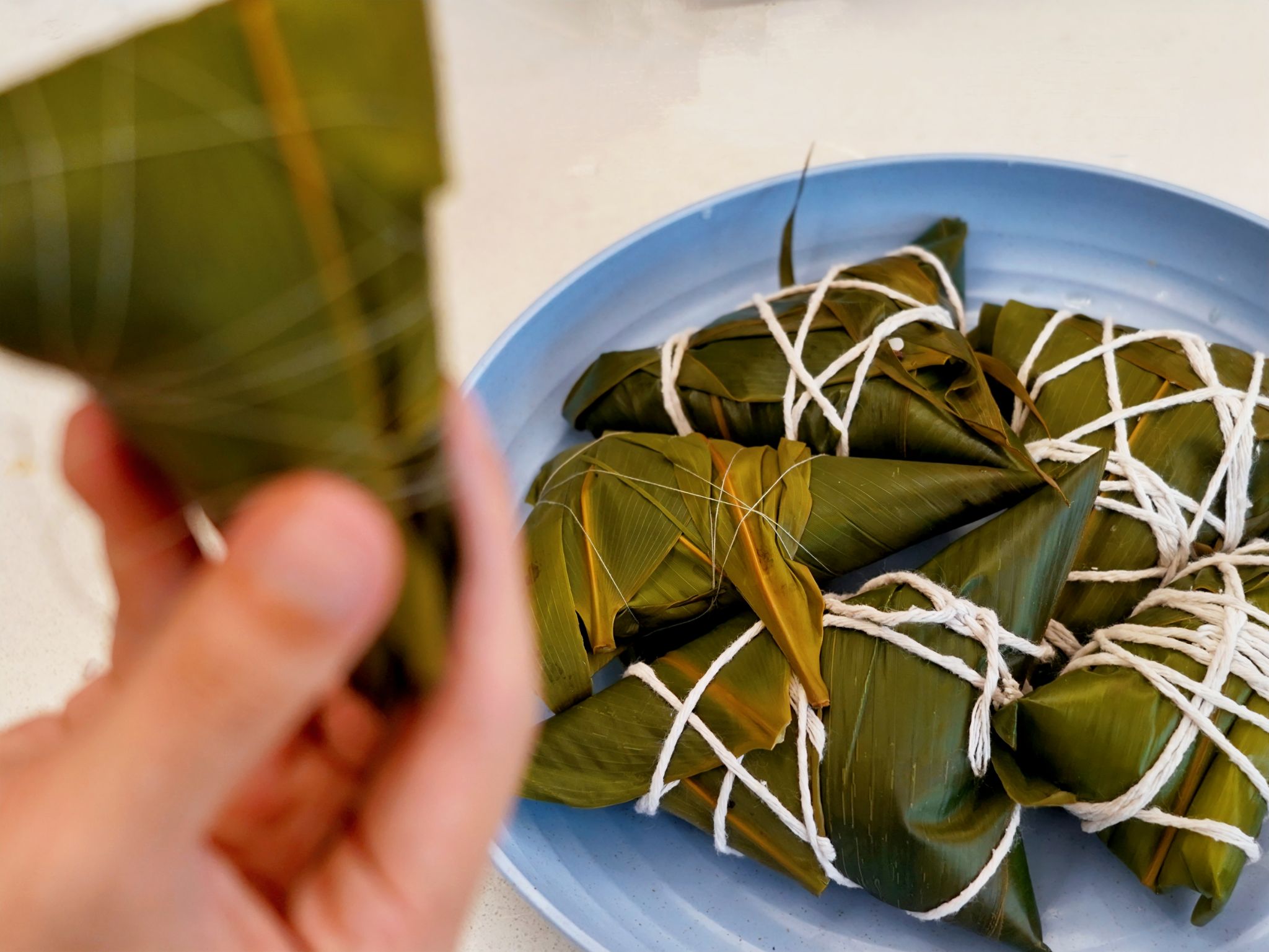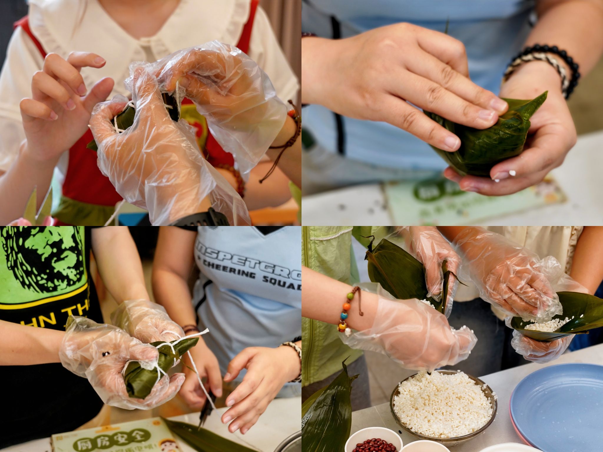 轮到同学们大显身手,选材环节,大家一丝不苟,仔细挑选着粽叶,有的偏爱宽大厚实的,有的钟情翠绿鲜嫩的;搭配馅料时,更是创意迸发,豆沙的细腻香甜、火腿肉的醇厚多汁、蛋黄的咸香浓郁,各种馅料在桌上琳琅满目。到了包裹阶段,同学们各展神通,有的双手笨拙,粽叶总是不听话地散开,急得抓耳挠腮;有的则心灵手巧,粽叶在手中翻飞,不一会儿,一个有棱有角的粽子就成型了。大家相互交流、互相帮助,现场气氛热烈而温馨。
