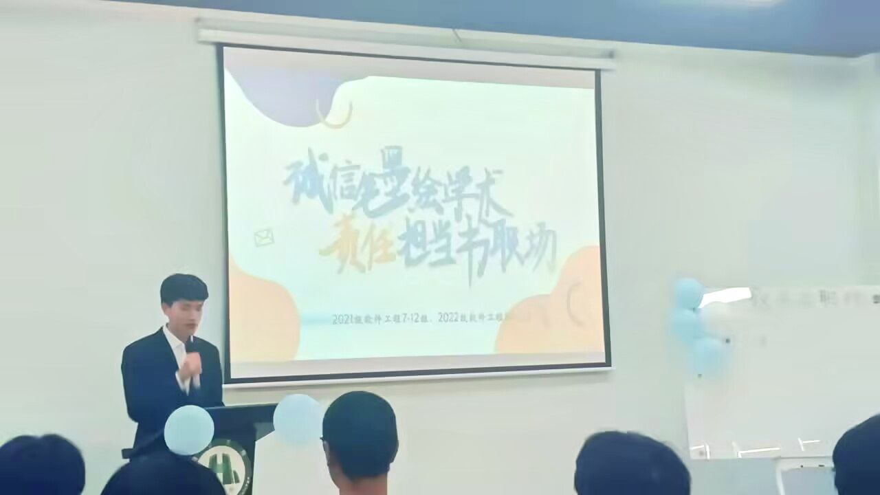 为进一步加强毕业年级学生的学术诚信教育,引导学生树立正确的职业道德观,助力其顺利从校园过渡到职场,信息安全学院于2025年5月21日14:00,在横山书院知物·多功能室教室成功举办了以“诚信为笔绘学术,责任于心书职场”为主题的年级会。本次年级会由2021级软件工程7-12班、2022级软件工程10-12班学生共同参与,旨在通过系列精心设计的互动环节,为即将踏上新征程的同学们扣好“学术诚信”和“职业责任”的第一粒扣子。