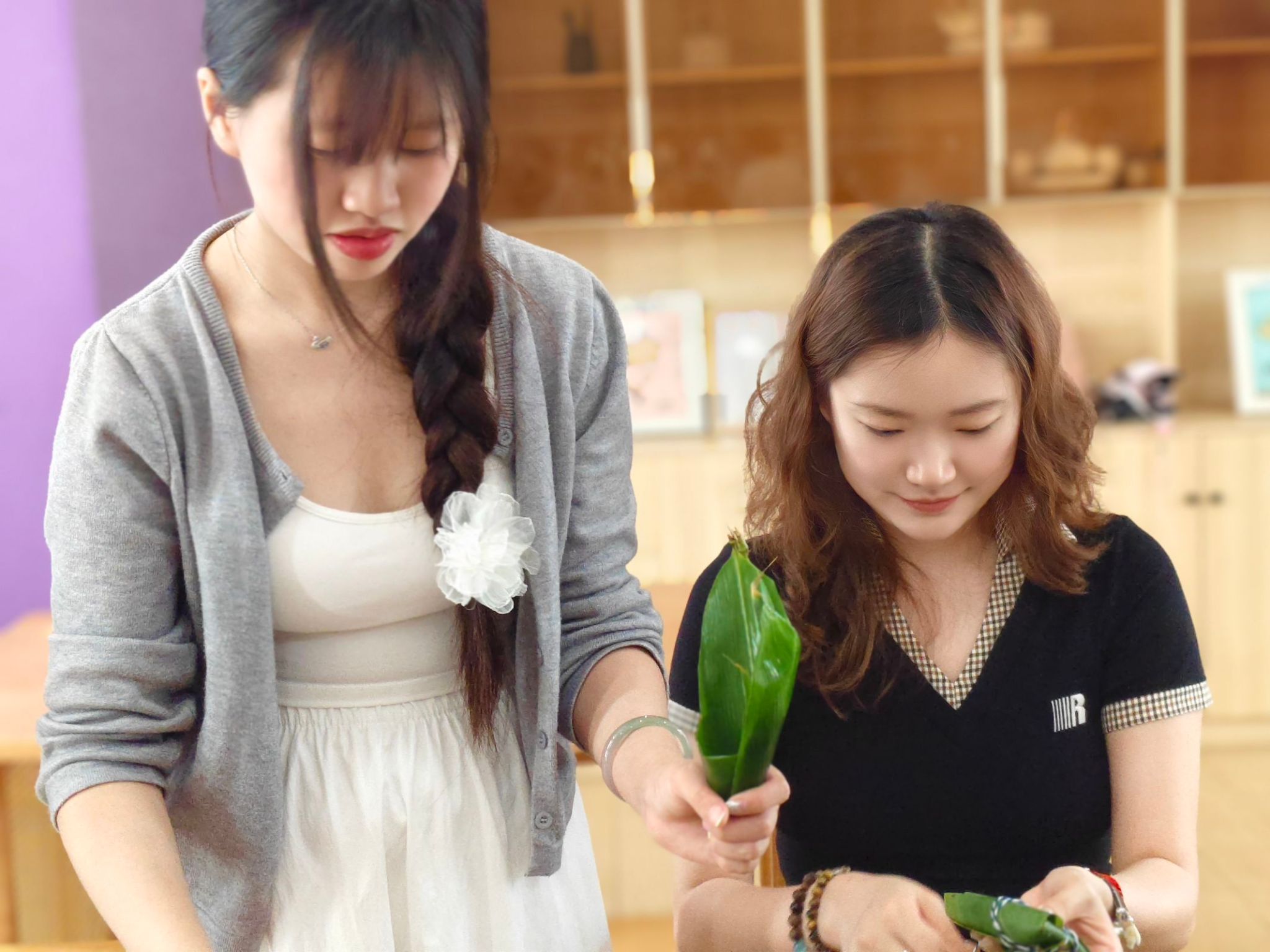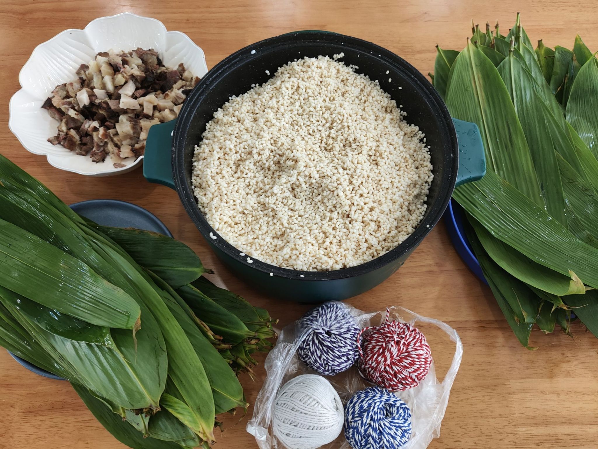 为本次活动顺利开展,老师们精心组织,提前做了大量的准备工作。他们采购了优质的糯米、新鲜的粽叶、丰富的馅料等食材,确保参与者能够包出美味可口的粽子。活动现场人头攒动,师生早早地来到场地,个个热情高涨,跃跃欲试。同学们走进现场就感受到浓浓的端午气息。会包粽子的同学作为“专业大师”,在他们的指导下,大家纷纷卷起袖子,开始动手包粽子。只见经验丰富的“大师”手法娴熟,他们将两片粽叶卷成漏斗状,放入适量的糯米,再加入五花肉、香肠、红枣等馅料,然后用棉线熟练地缠绕几下,一个棱角分明、饱满诱人的粽子就包好了。而同学们则在一旁认真学习,虽然动作略显生疏,但也都努力尝试着,现场充满了欢声笑语。