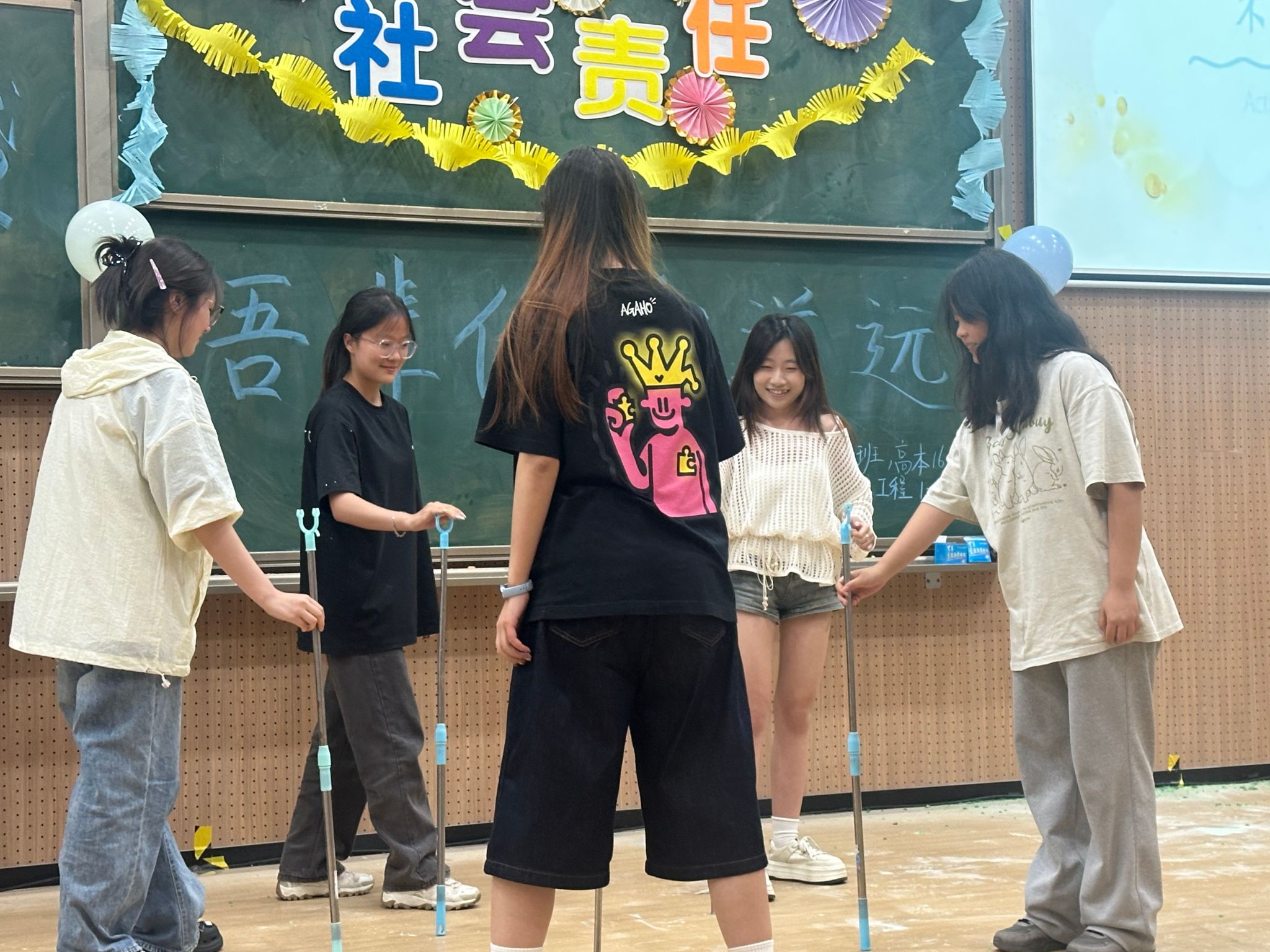 在"不倒森林"的团队挑战中,同学们带着期待与紧张默契地围成同心圆,紧握“责任”的接力杆。每当杆身倾斜,总有坚定的手稳稳托住,恰似青年担当时代使命的缩影;每次默契交接,都是个体融入集体的生动诠释。大家在笑语中收获了友谊,也在彼此心中埋下了责任的种子。