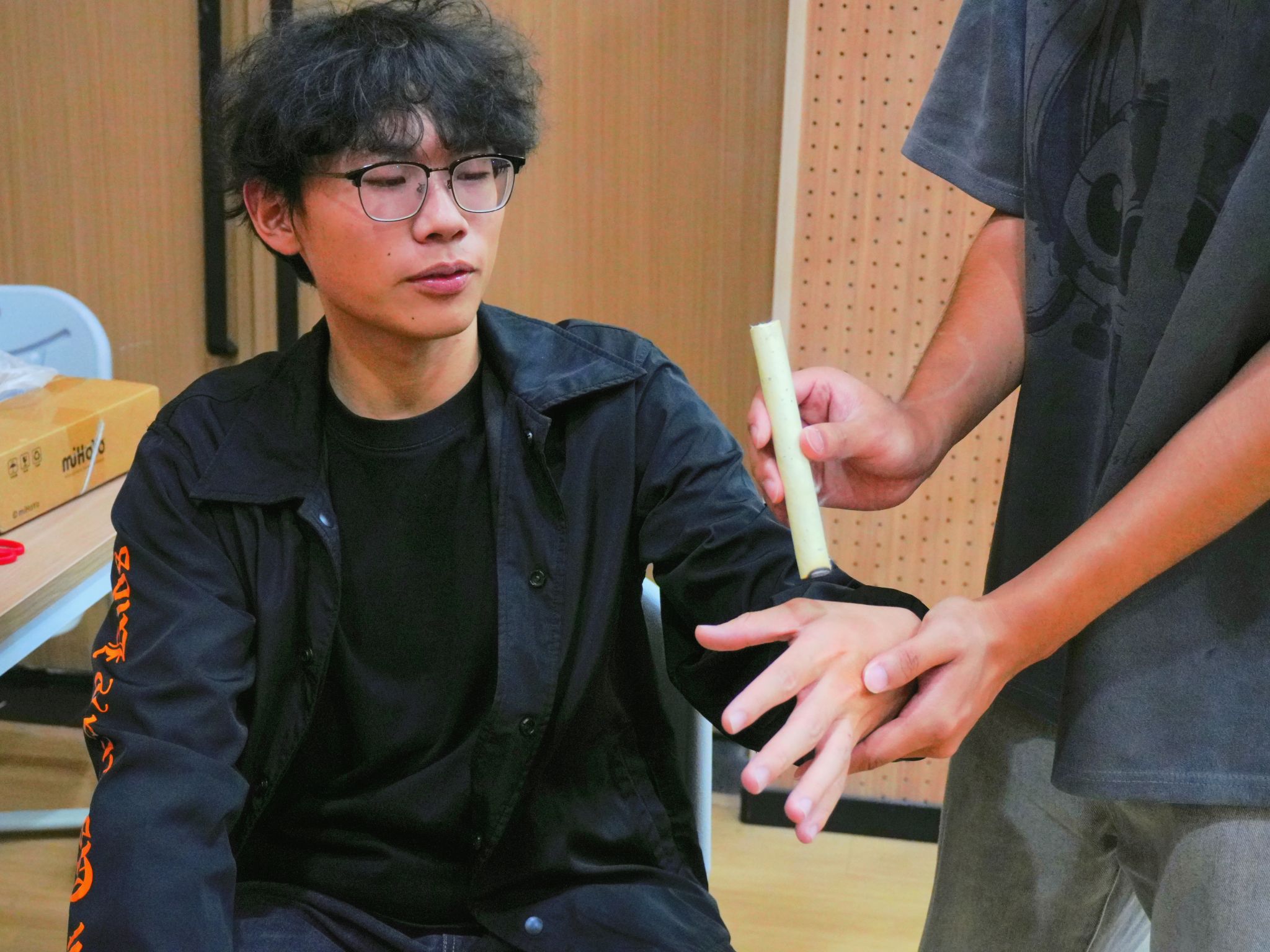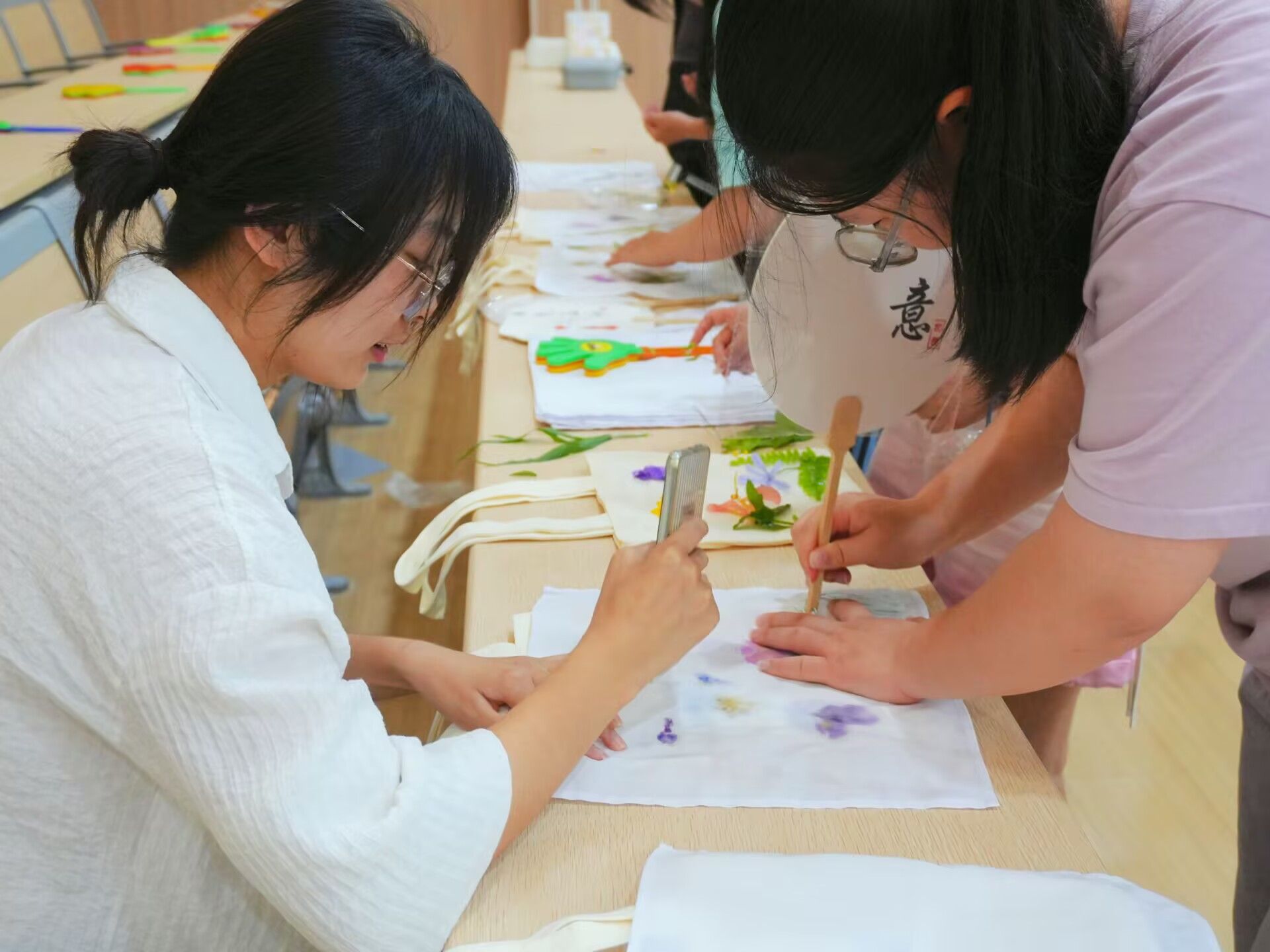 非遗传承环节聚焦艾灸、漆扇、拓染三项非遗技艺。主持人现场讲解了艾灸的中医原理与操作方法,展示漆扇“飘漆”工艺的东方美学,演示拓染技艺如何将植物纹理转化为艺术纹样。随后,同学们开始沉浸式体验传统工艺,在动手实践中感受非遗的生命力,探寻科技与文化融合的创新路径,让古老的文化焕发新生。