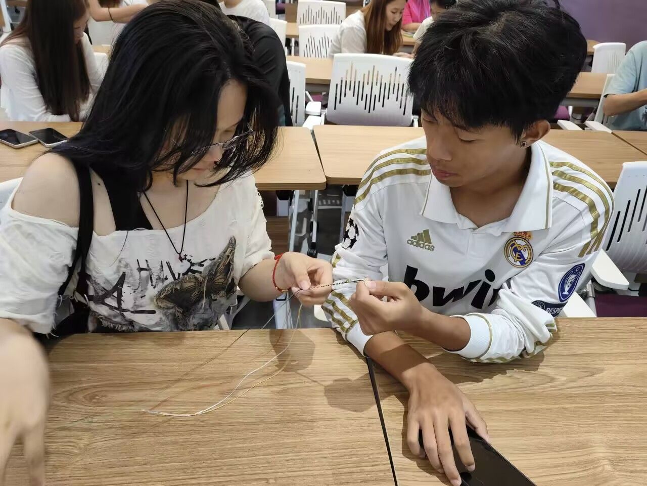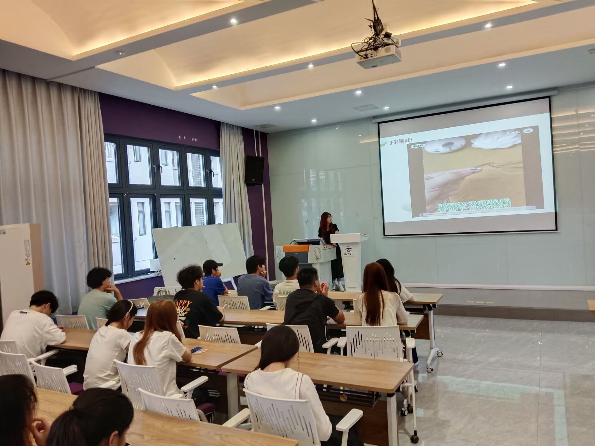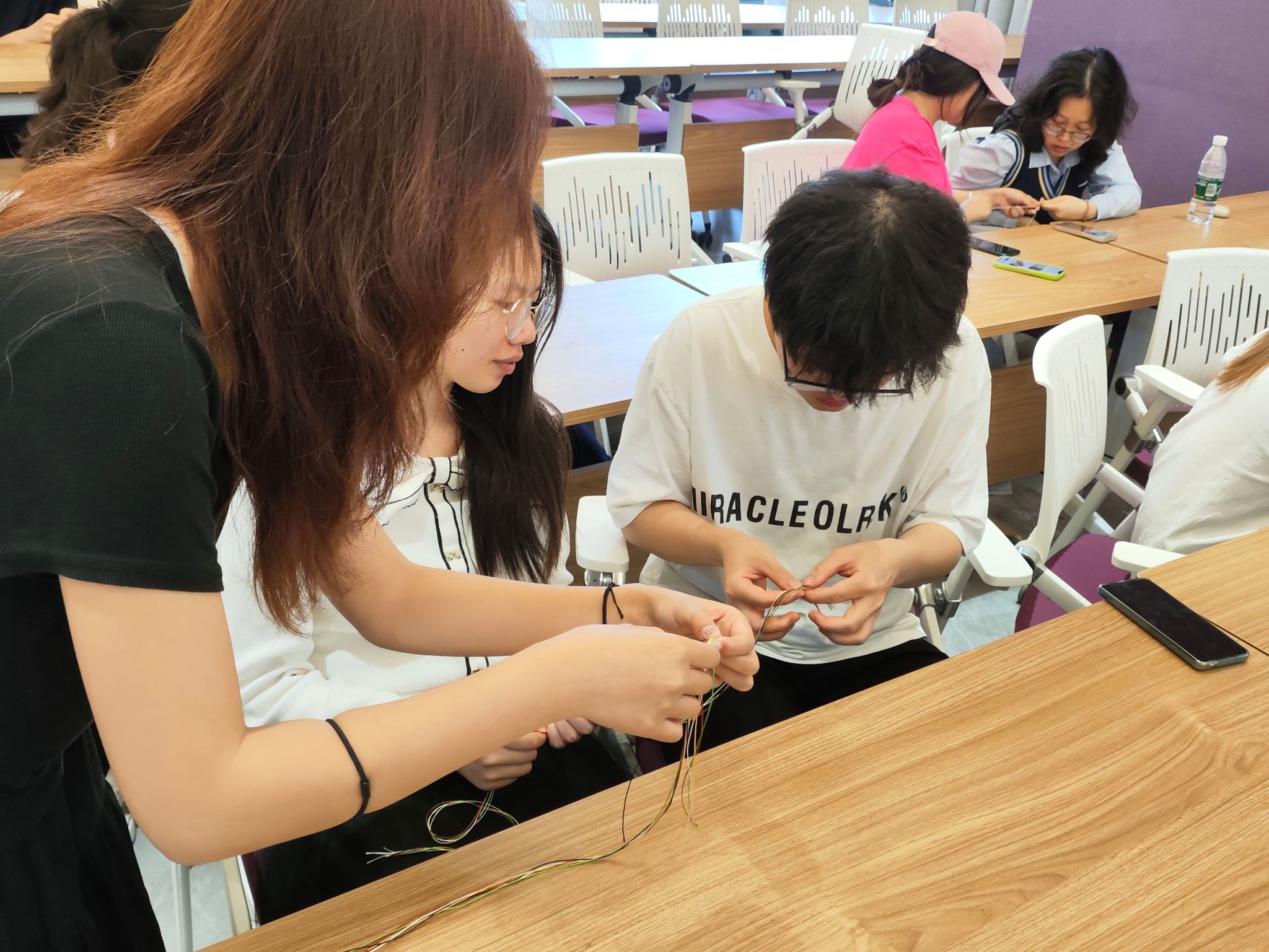 主持人讲解五彩绳颜色寓意后,同学们分组协作编织。编织结束,每组代表分享“心中的爱国人物故事”,古今结合,加深了大家对爱国精神的理解,将活动推向高潮。