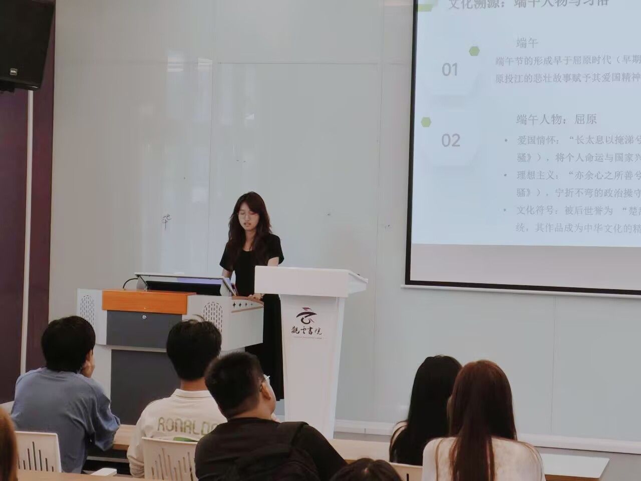 主持人引导同学们探寻历史人物与青马学员的精神联系。对比屈原投江和青马学员基层奉献、伍子胥忠诚与马克思主义者坚守真理,挖掘其中共同精神。互动提问环节,同学们积极发言,现场讨论热烈。