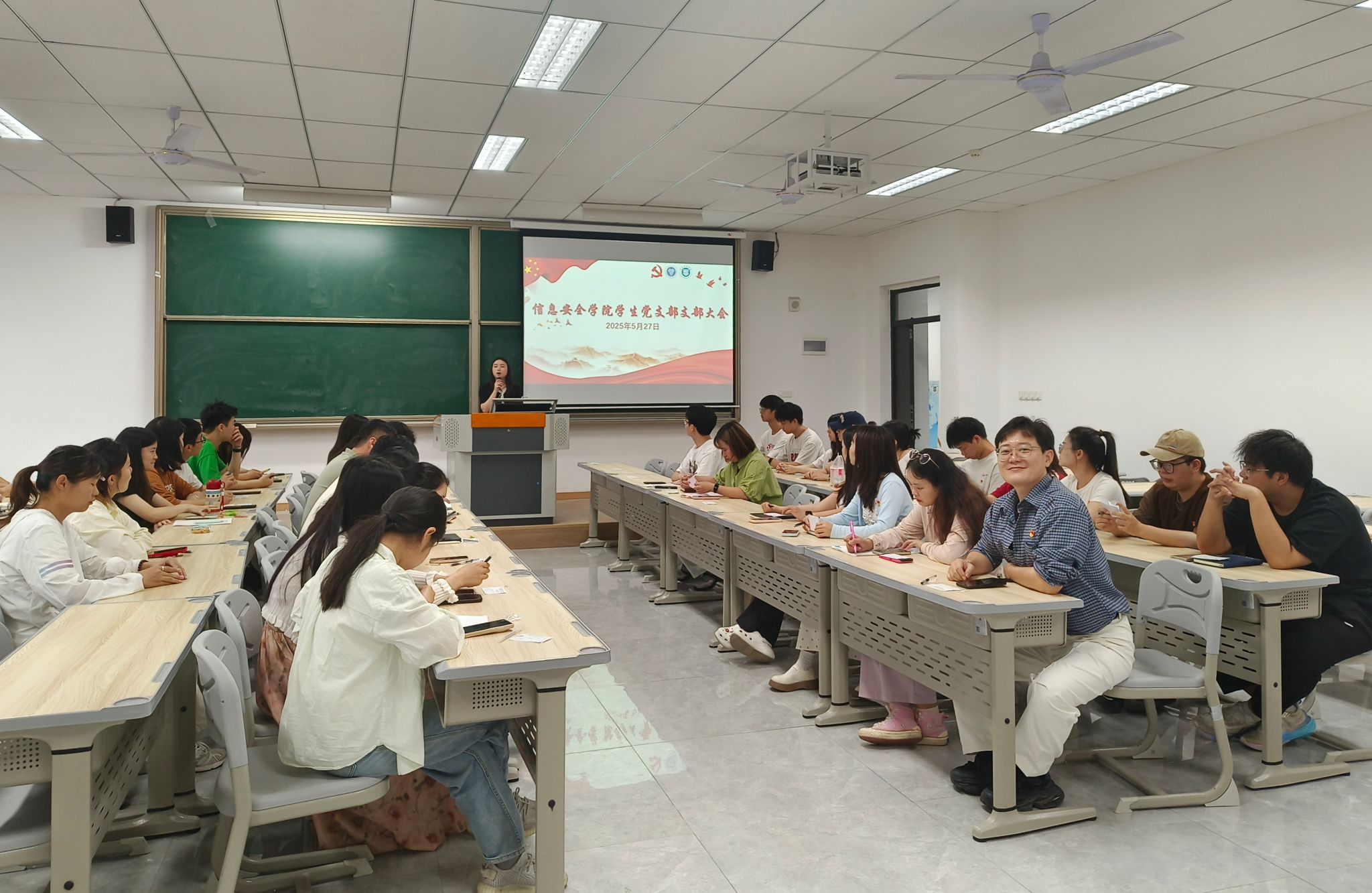 2025年5月27日,信息安全学院学生党支部于贤者楼313教室召开2025年上半年预备党员接收大会。本次会议以严格规范党员发展程序、提升党员队伍质量为核心,聚焦陈妍静方、胡金明等10名发展对象的入党事宜,同时结合中央八项规定精神学习,深化支部思想作风建设。会议由支部组织委员谭倩同志主持,支部党员通过线上及线下形式参与。